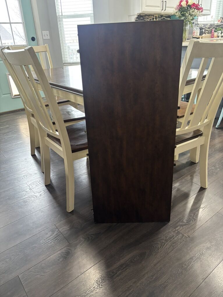 Good condition! Table comes with 4 chairs, bench and a leaf, table measures 60x42x30 without leaf, with the leaf table measures 78x42x30. Bench measures 46x16