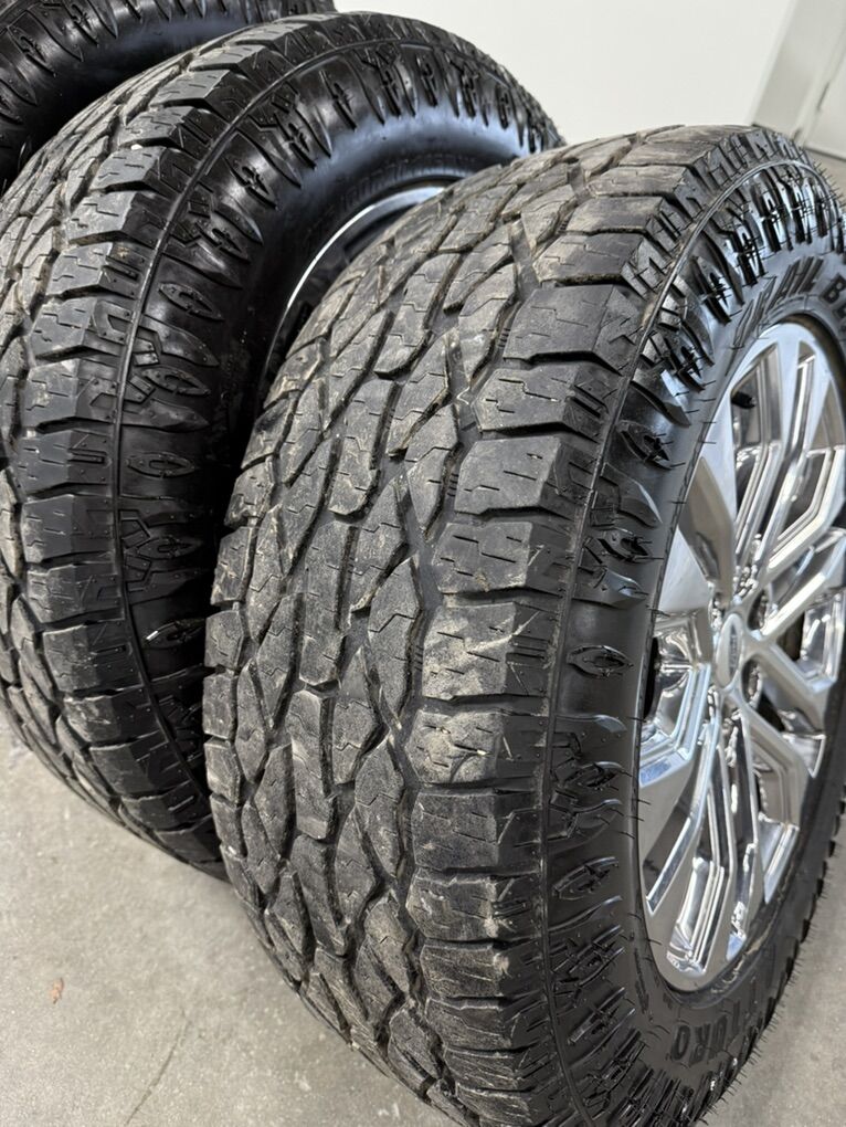Wheels are 20in OEM wheels off a 2025 ford f150 premium package. Very hard to find wheels, thy are in great shape, no curb rash or major damage on them, light average wear on them. All of the center caps are also included and in great shape as well. TPMS are also included. Tires are are 275/60/20 atturo trail blade ats, top of the line tires no patches or plugs in them, tires are in like new shape with 85-90% tread left