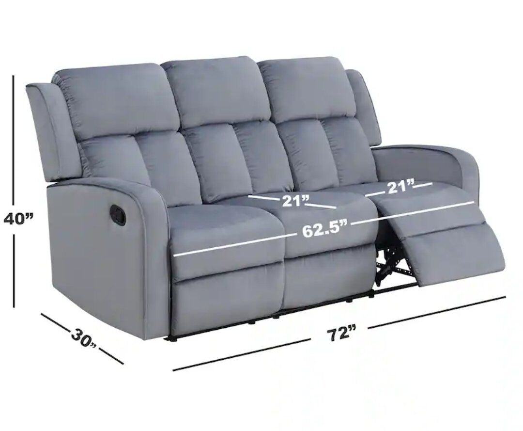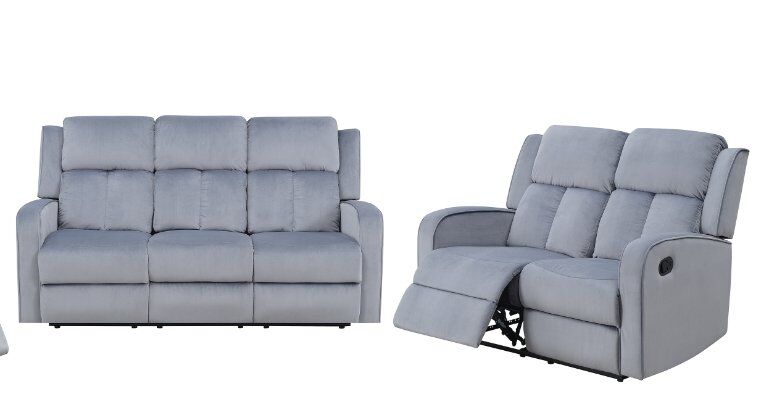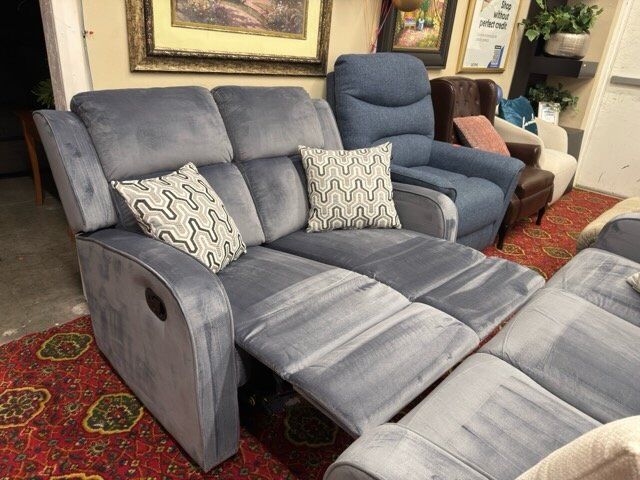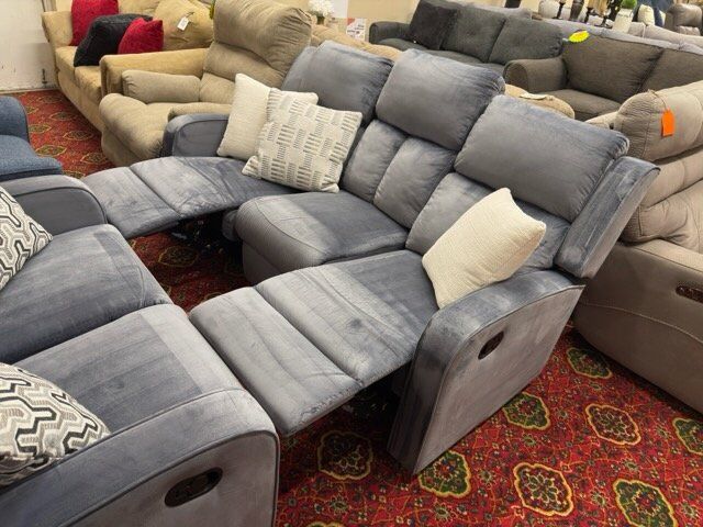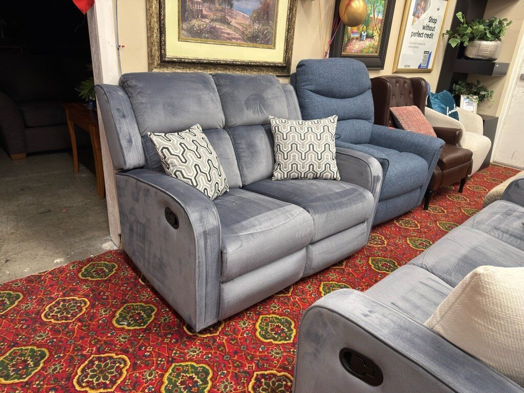Beautiful Sofa and Loveseat recliner set. Gorgeous light blue /gray fabric upholstery, soft velvet feel. Not too large or too small, perfect size while still giving comfort with manual recliners! Great condition! Located in Layton.