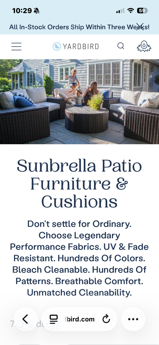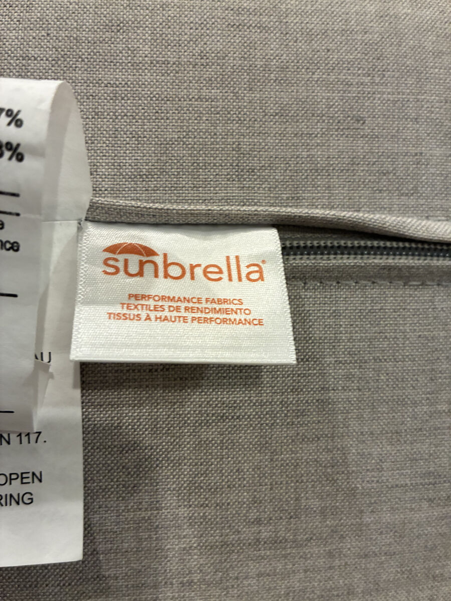 Rust-proof powder-coated aluminum frames with a warm teak-look finish — lightweight and durable (Yardbird offers a 10-year frame warranty) UV and Fade Resistant All seat and back cushions are Sunbrella Performance Fabric (fade-resistant, stain-resistant, water-resistant — see tag photo). Yardbird uses Sunbrella exclusively. Cushion covers are zippered and removable for easy cleaning Everything is clean, well-maintained, and has been used indoors