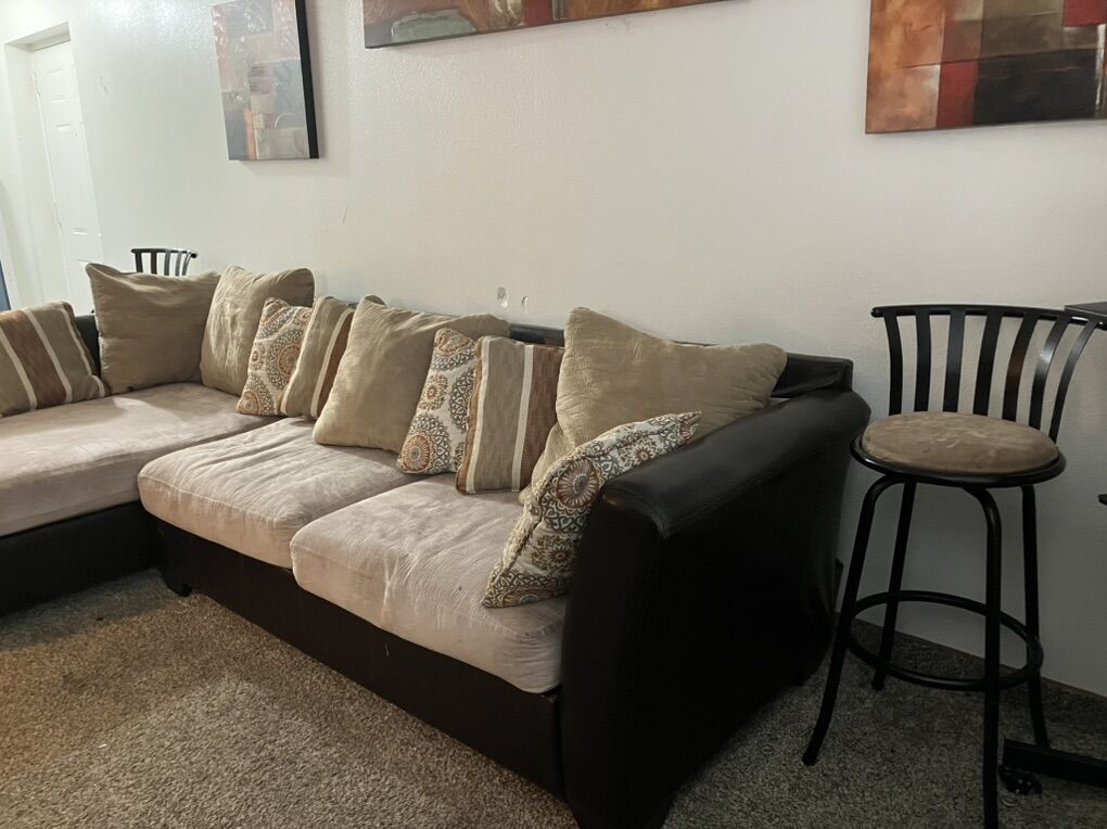 Moving sale! The covers come off the cushions and are washable. I washed it about 3 months ago with the pillows. You can wash them and also they have covers for them. Couch is solid and comfortable.
