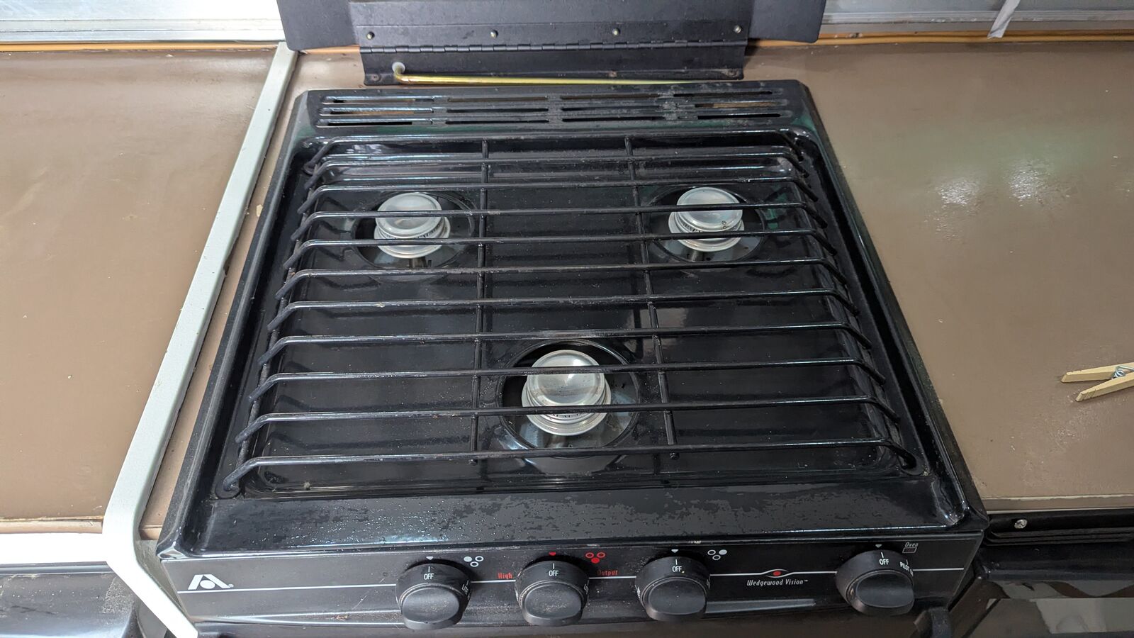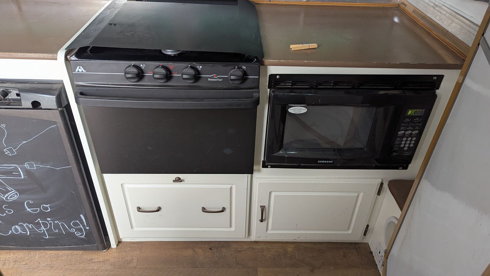 Kitchen equipped with 3-burner stove, oven, refrigerator, sink, and microwave