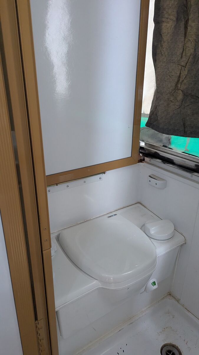 Full indoor bathroom with cassette toilet, shower, and sink – rare in pop-ups!