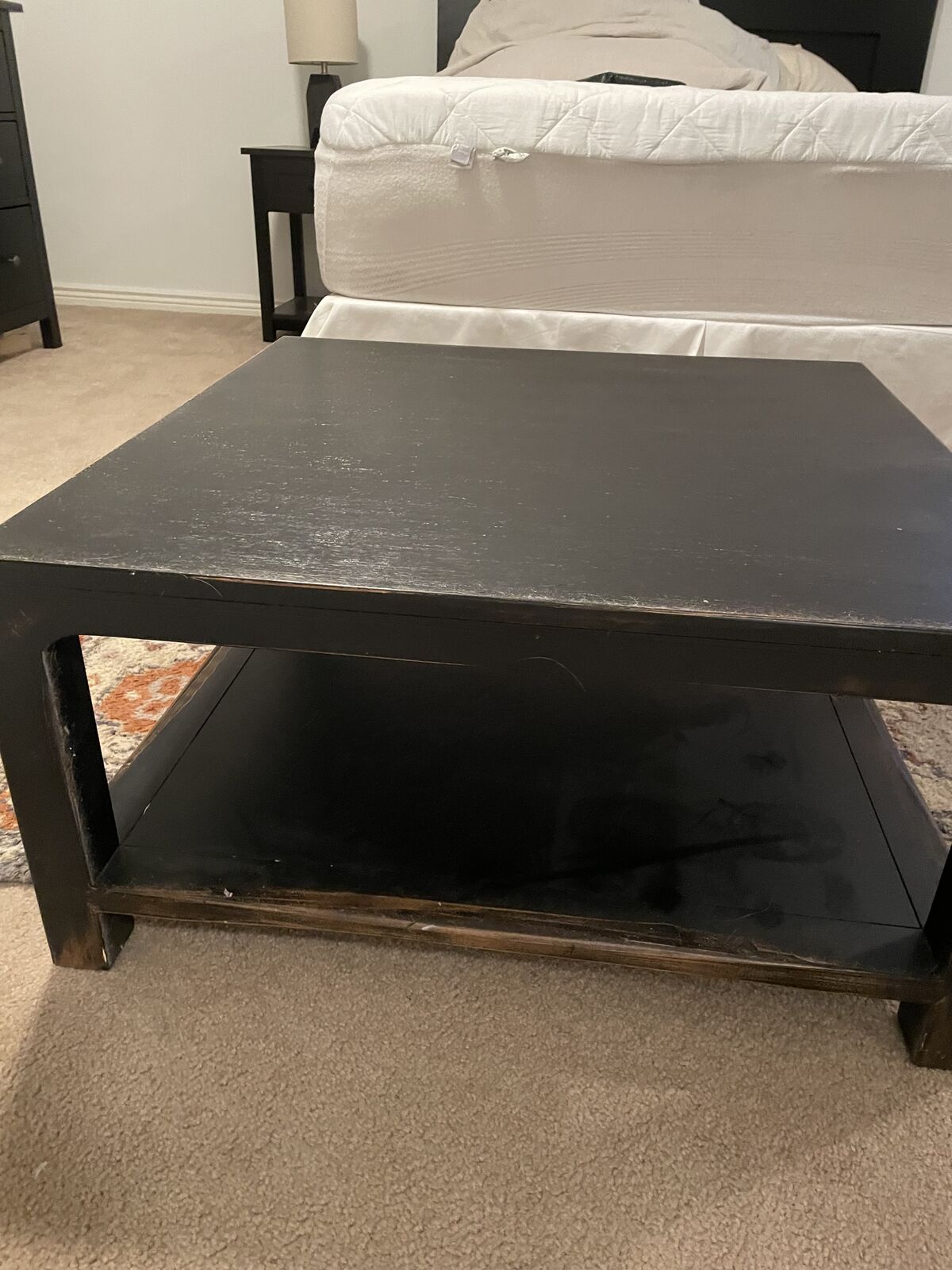 Pottery Barn distressed black wood coffee table in great condion. Measures 31" square by 15" high. Has lower shelf.