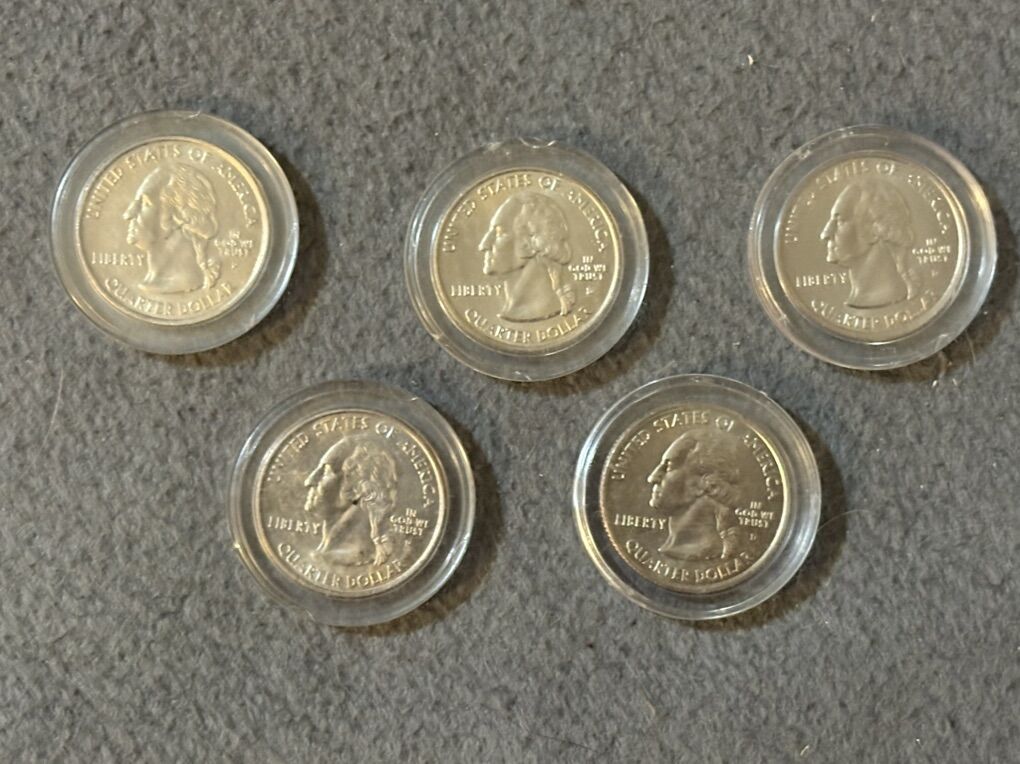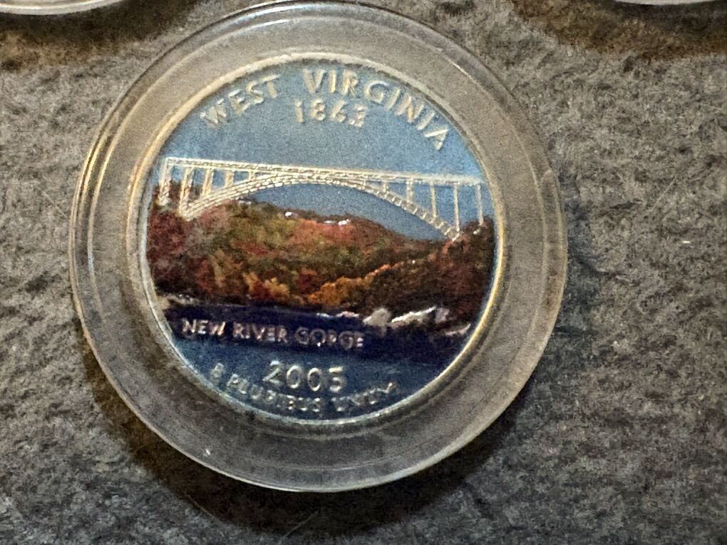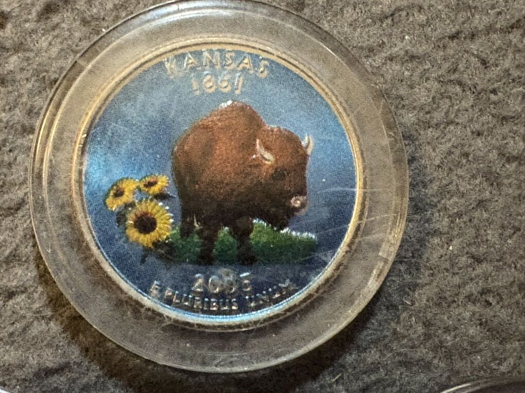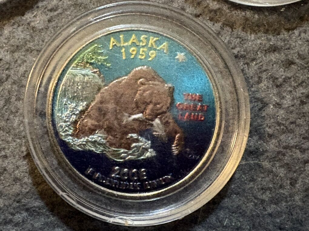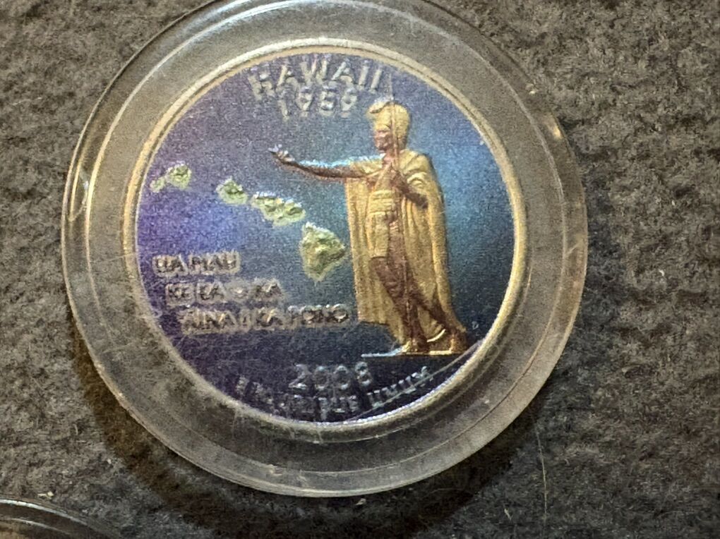 Venmo5 State Quarters in Color, Wisconsin, West Virginia, Kansas, Alaska, and Hawaii. One side is in full color and the other side is normal. See pics