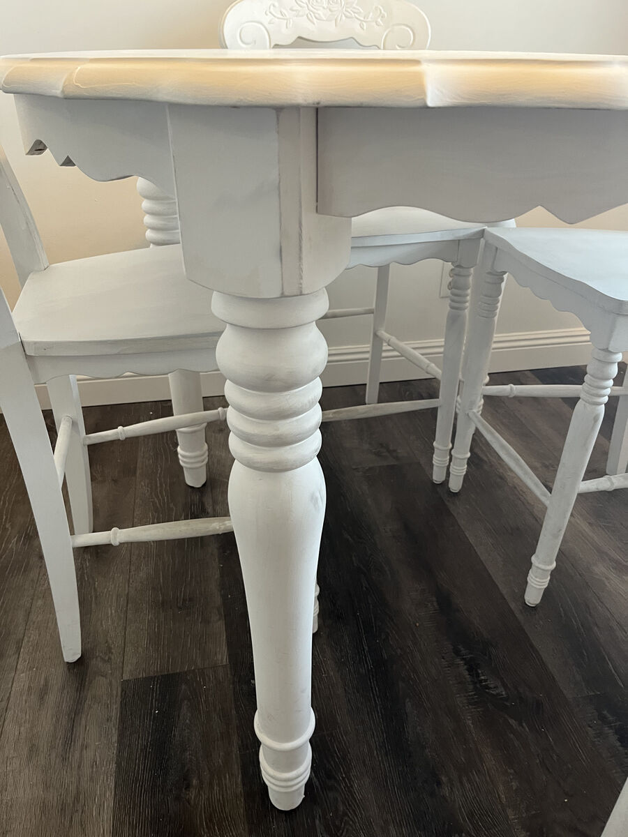 This charming set is perfect for a small space. The round table and chairs are in great condition. The table has a scalloped edge and the chairs have a charming design.