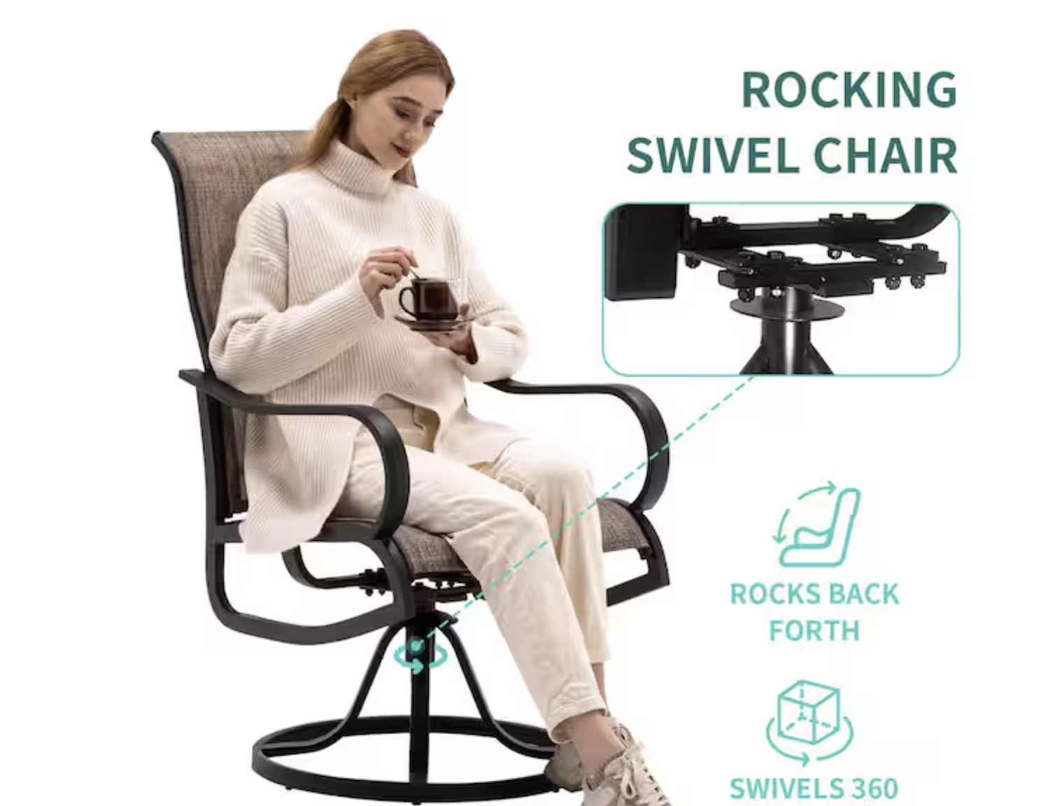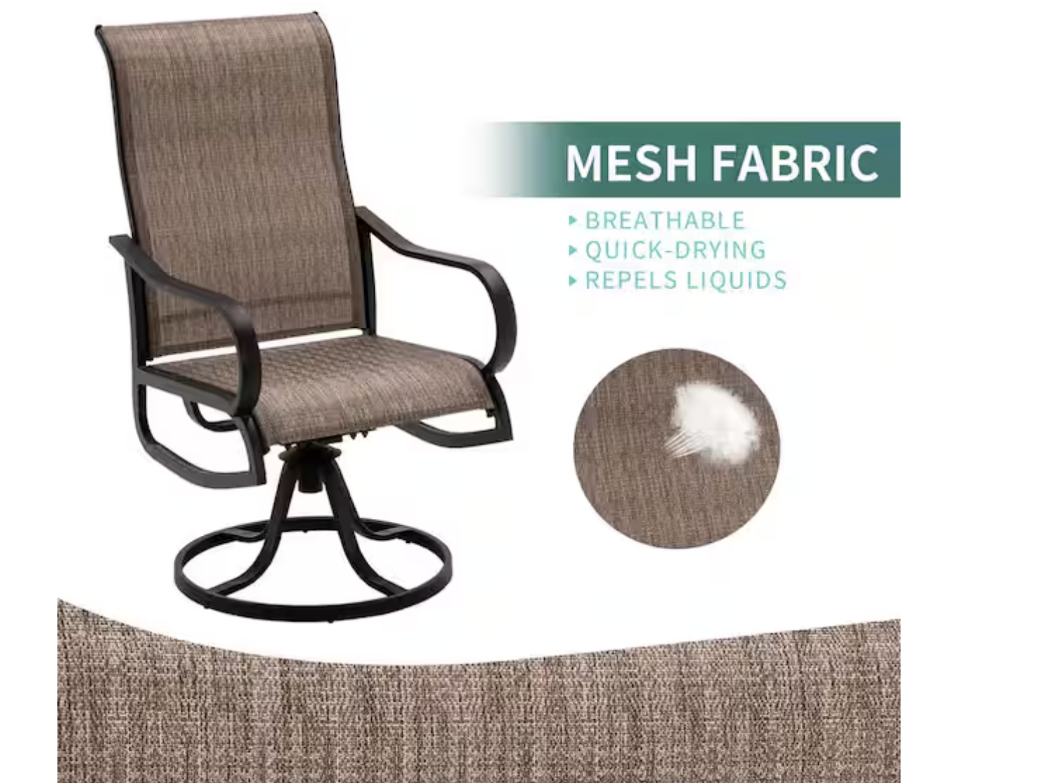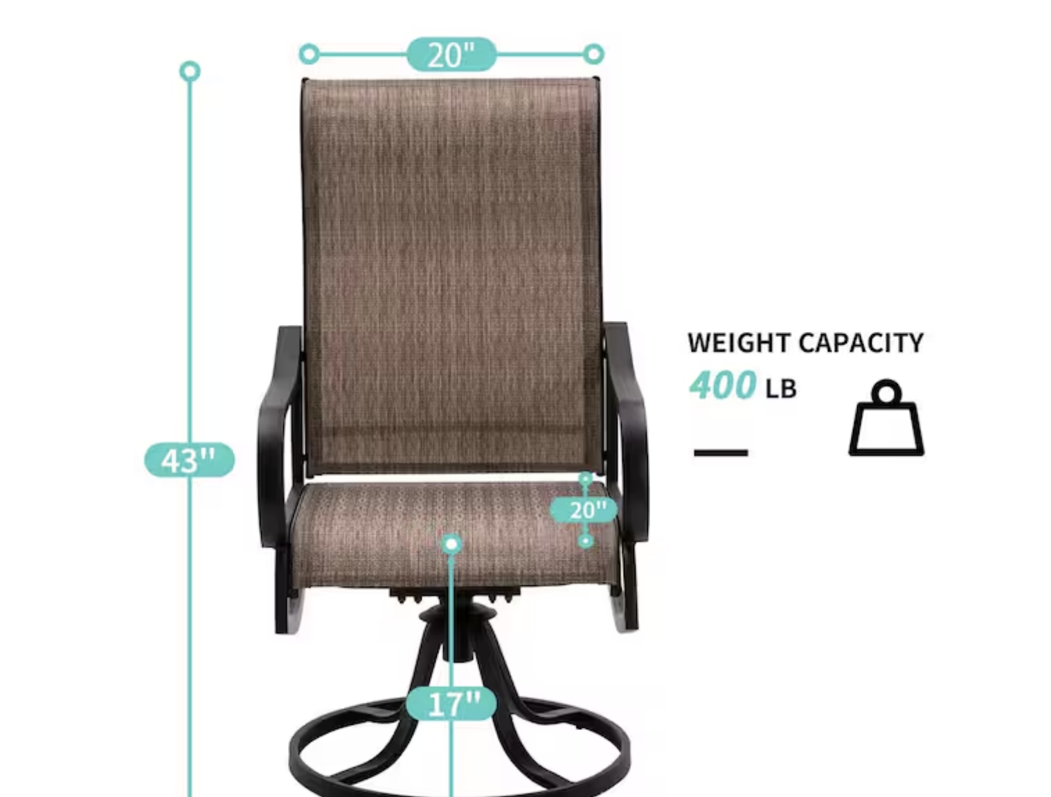Our outdoor breathable sling swivel chair features a durable metal frame that is resistant to rust and weather damage, ensuring its longevity for many years of outdoor use. This high-quality outdoor furniture will elevate your living experience, providing both comfort and style. Comfortable swiveling outdoor dining chairs: dine in style with these outdoor dining chairs that offer 360° swiveling and a slight rocking motion for added comfort with a 400 lb. weight capacity, the ergonomic design of the seat and backrest provides the ultimate dining experience Durable all-weather PVC-coated polyester fabric: these outdoor furniture chairs are made with breathable PVC-coated polyester fabric that is rust and weather-resistant, making it easy to maintain Ideal for both indoor and outdoor use, they are perfect for your garden, deck, pool, kitchen, living room, or dining room High-back design and sturdy construction: featuring a high-back design for added comfort, these patio furniture chairs are also designed with a half-packed seat front for comfortable seating The metal frame is coated with powder and supports up to 440 lbs. With multiple combination options, each chair measures 19.2 in. seat width, and 41 in. height, with a 17.7 in. seat depth and 26 in. back height, choose from a variety of combinations, including outdoor chair sets of 2, 4, 6, and 8, dining tables, and patio dining sets Easy-to-clean textilene fabric: these chairs are made with textilene fabric, which is both stain-resistant and easy to clean, simply wipe with a damp cloth or hose down for a quick refresh, this fabric also dries quickly, making it perfect for both rainy days and everyday use, enjoy low-maintenance luxury with chairs that stay looking great with minimal effort