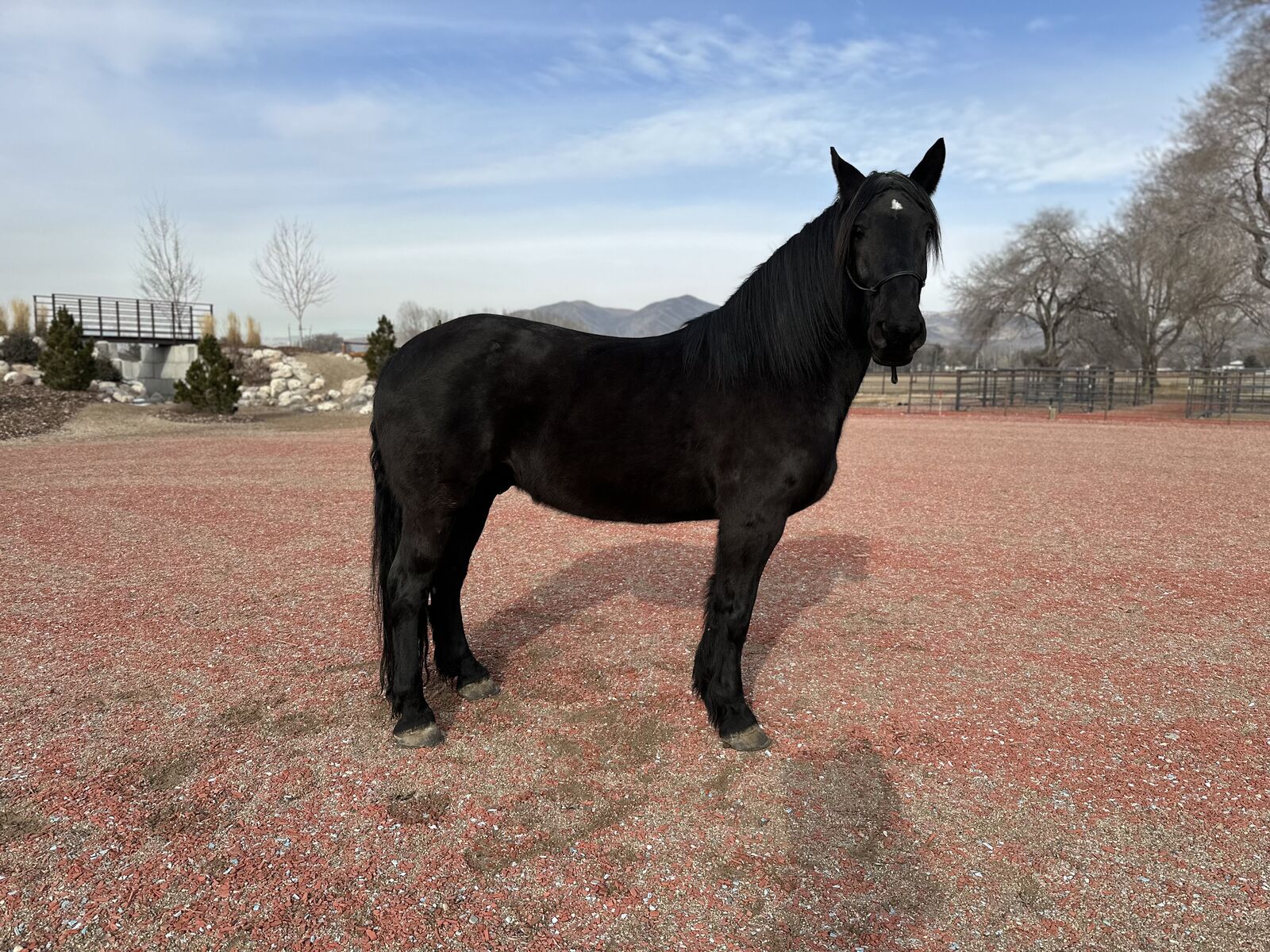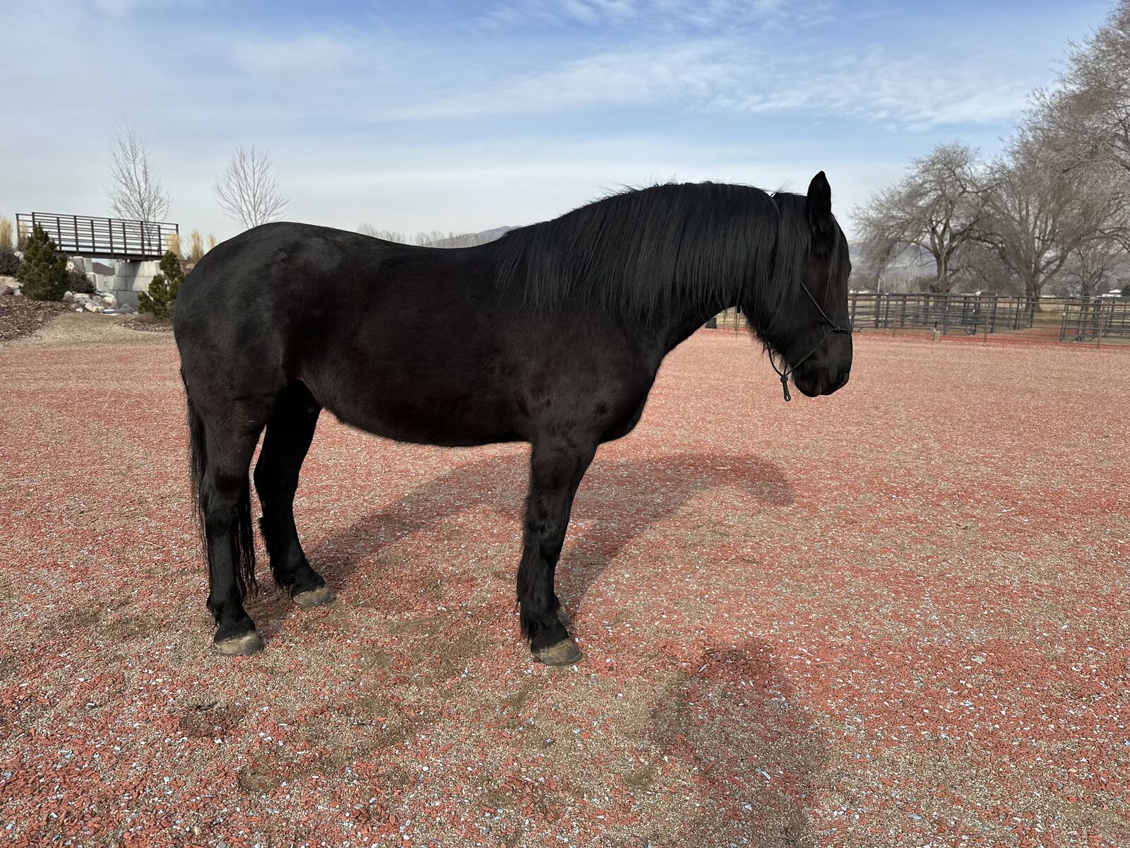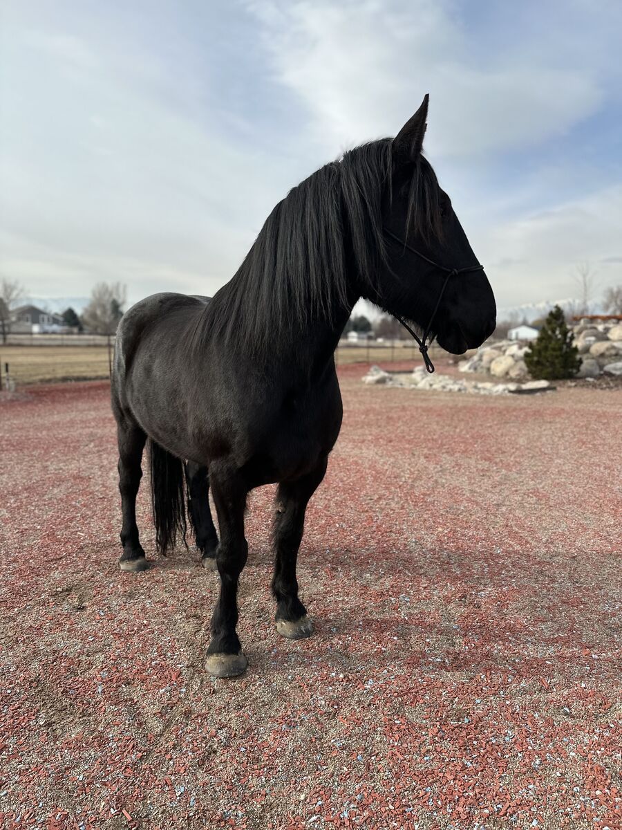 I am going to show you the fanciest Friesian cross you have ever seen. Drogo will get you noticed absolutely anywhere you go. This gelding stands 17 hands tall and weighs around 1200 pounds. Drogo came originally from a cow-calf operation out of West Texas and moved to Utah in 2023. This 9-year-old gelding is green broke and looking for the right person to invest time into developing him into the horse of their dreams. This horse is sound, will stand tied all day, and loads and unloads like a pro. He has “more go than whoa,” but has a great stop and some cool buttons on him.