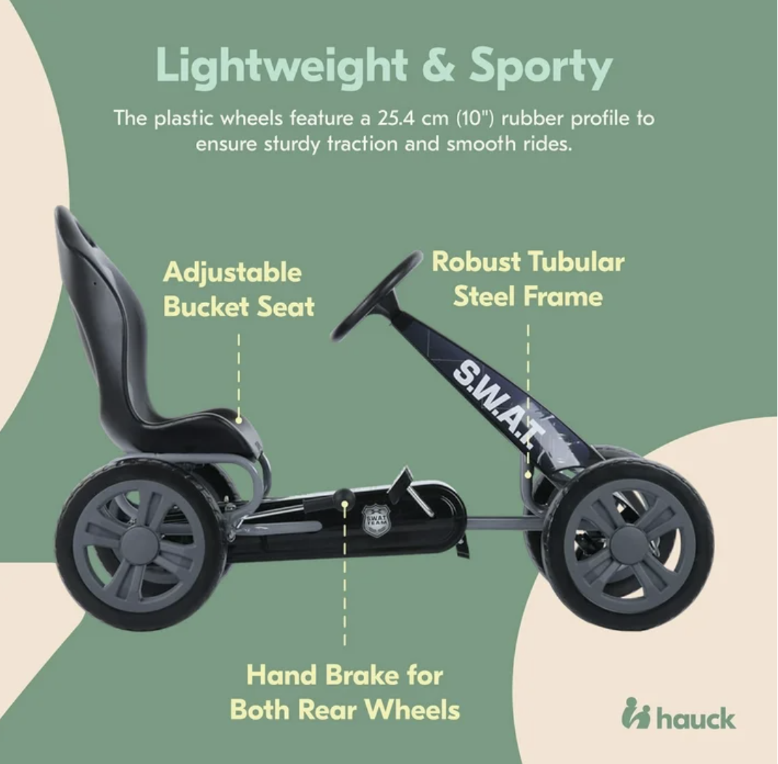 Brand new in box, hauck Cyclone Pedal Go Kart with Adjustable Bucket Seat for Kids Ages 4 to 8, S.W.A.T.