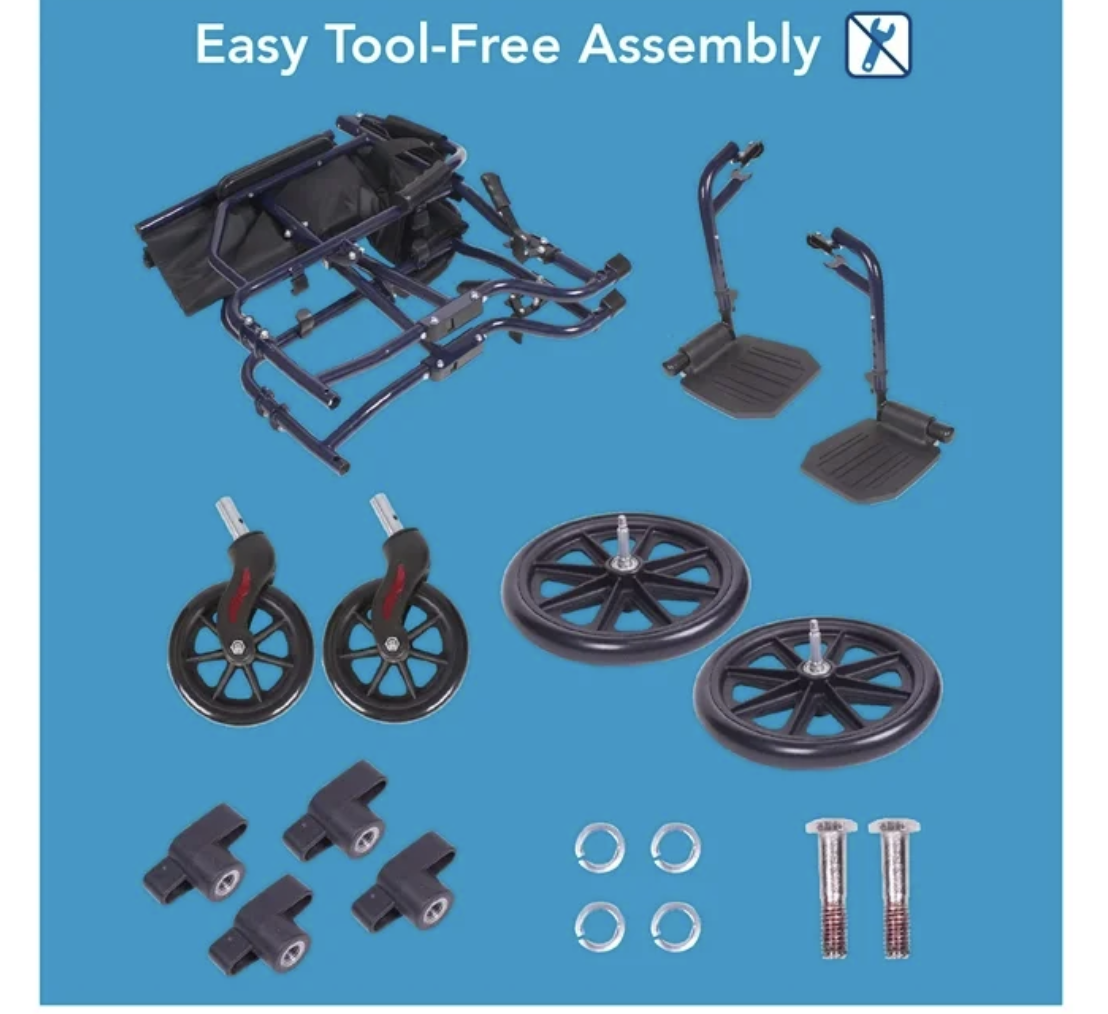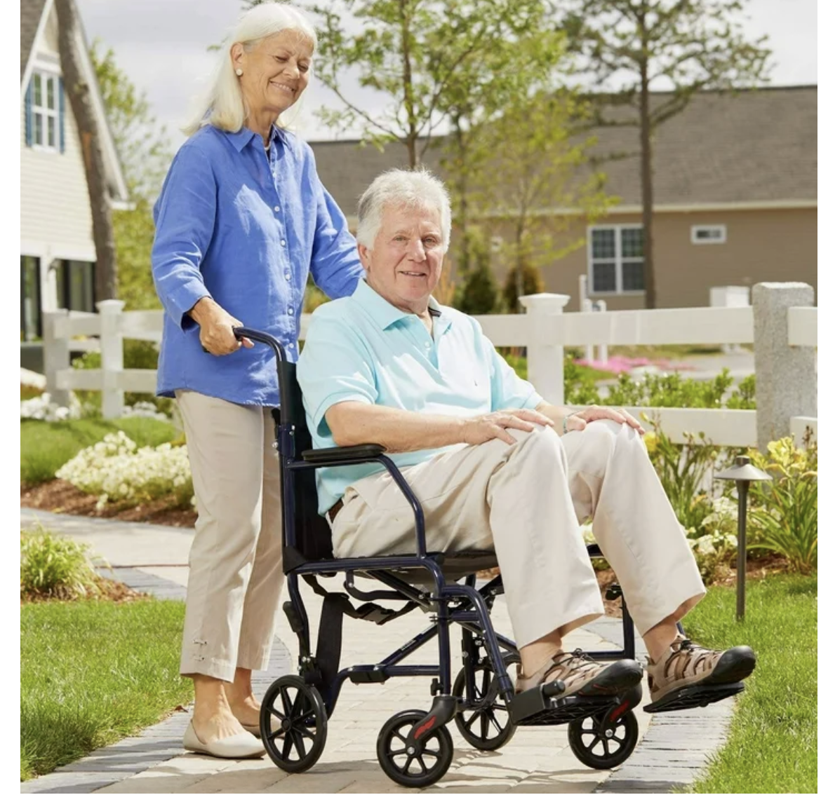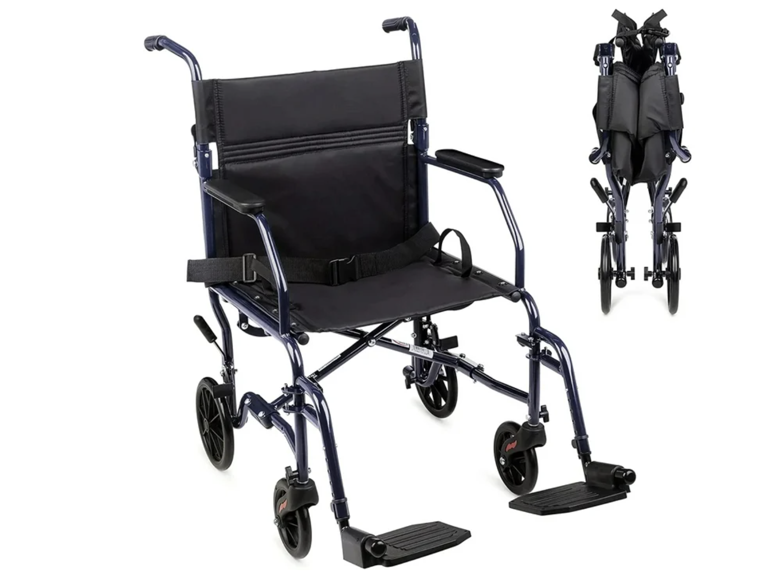 The Carex Classics Transport Chair offers safe, sturdy, and comfortable mobility with oversized 8" wheels for smooth maneuvering across multiple terrains. Built with durable steel, it supports up to 300 lbs while remaining lightweight at only 25 lbs. A wide 19" seat ensures comfort, and the adjustable swing-away footrests provide leg support or can be removed for storage. The chair folds compactly for travel and features a seat belt for added safety, making it ideal for everyday use and transport. The Carex Transport Chair Provides a comfortable push for both the caregiver and end user Features large 8" wheels for a smooth glide over multiple terrains Made of durable steel for stability and to support up to 300 lbs Lightweight at 25 lbs and folds to 9" wide for easy storage Large 8" wheels provide a smooth ride and easy maneuverability The sturdy steel frame folds easily for storage and transport and can fit in most standard-sized trunks 19" seating area and armrests are padded with foam to keep long rides comfortable Includes removable and adjustable swing-away footrests and a seat belt Product Weight Capacity: 300 lbs Product Weight: 32 lb Packaging Height:31" Packaging Width: 23.4" Packaging Depth: 10.25" Shipping Weight: 33 lbs Color: Blue