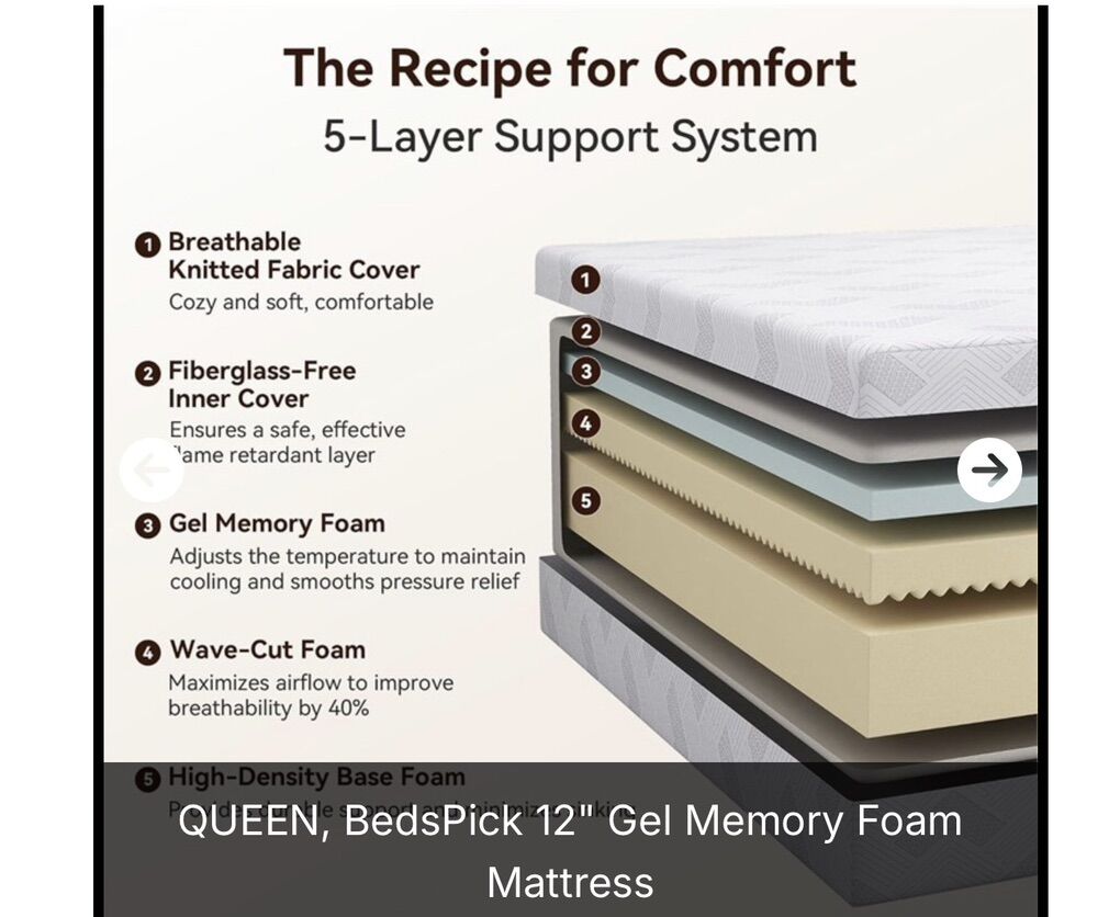 VenmoUltimate Comfort Bedspick medium feel 12 inch queen size mattress features with a 3-layer all-foam system, delivering a cozy sleep experience throughout the night. Topping it off is a gel-infused memory foam that keeps you cool and comfortable. The wave-cut foam layer enhances airflow across the entire queen mattress, boosting breathability by 40%. Meanwhile, the high-density base provides durable support and minimizes sinking. Pressure Relief & Motion Isolation Bedspick 12 gel memory foam mattress features 3 distinct foam layers for medium firmness. The gel memory foam works with comfort foam to distribute pressure evenly and contour to your body. Two layers of high-density base foam enhance durability, providing the support your body needs for proper spinal alignment. They also resist sagging and prevent nighttime roll-off. Whether you sleep alone or with a partner, you'll enjoy undisturbed sleep. Comfortable & Removable Washable Cover Featuring a cover crafted from high-quality knitted fabric, the queen mattress offers superior comfort and lasting durability. This knitted fabric boasts excellent breathability, a soft touch, and enhanced airflow all combining for a cooler night's sleep. A high-quality zipper on the mattress bottom makes cover removal easy simply toss the cover in the washing machine for a quick clean. This protects your mattress from stains and keeps the sleeping surface hygienic. Certification for the Safety Fiberglass-Free inner cover provides a safe, effective flame-retardant layer without the risks of fiberglass or other flame-retardant chemicals
