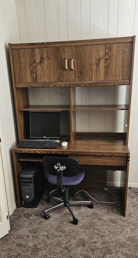 Solid wood-look computer desk with upper hutch and enclosed storage. Perfect for a home office, student room, or compact workspace. Features: Spacious desktop Built-in upper shelving Two cabinet doors for hidden storage Keyboard tray Sturdy, stable construction Classic woodgrain finish Plenty of storage for books, printer, office supplies, or décor. Compact footprint but very functional. Good used condition. Normal light wear consistent with age.