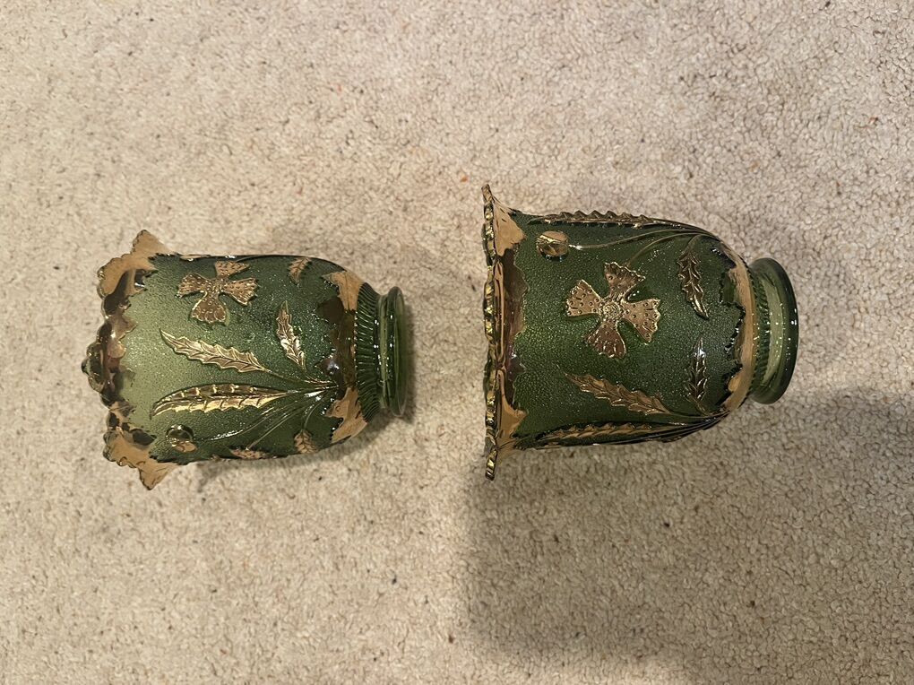 VenmoThis is a Rare set of early American Pattern Glass made by US Glass. They started making glass in 1899. This is a pattern called Delaware, which was part of their State Series. These are in excellent, like new comdition. They measure 4 1/4 inches tall x 4 1/4 inches across. It is 2 inches where is connects to the lamp. Sold only as a set. Selling for a parent. Must see!