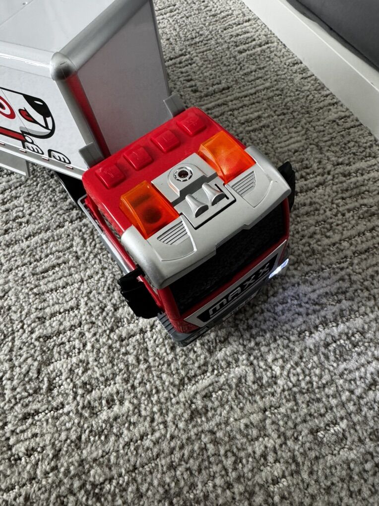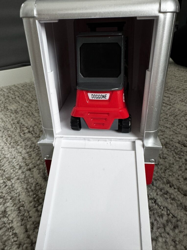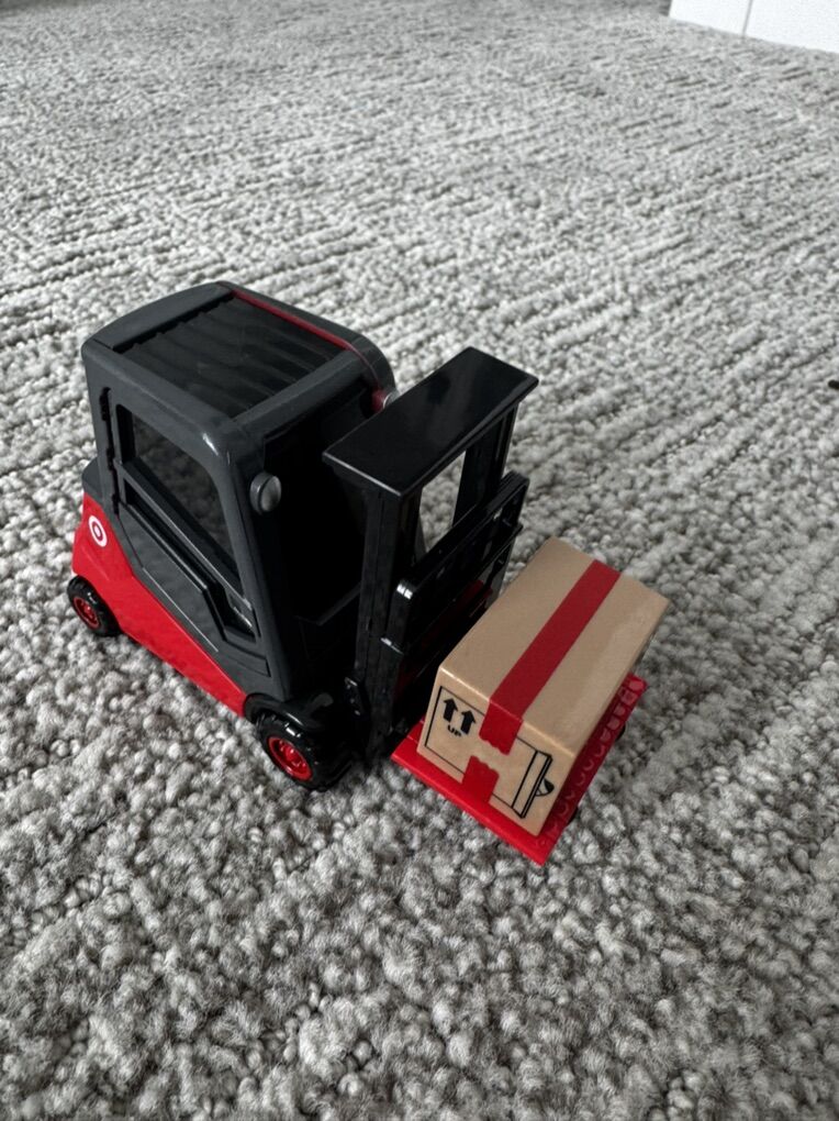 The back opens with a ramp for the forklift to go up and down. There’s also a little target box that can be lifted and lowered. Lights and sounds for interactive play.