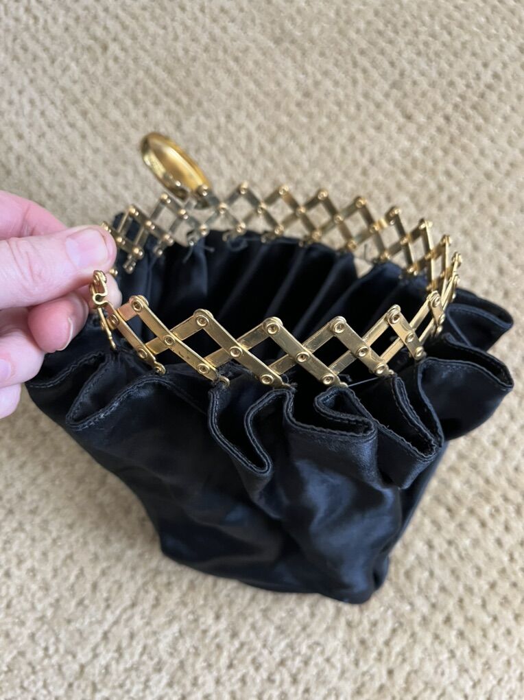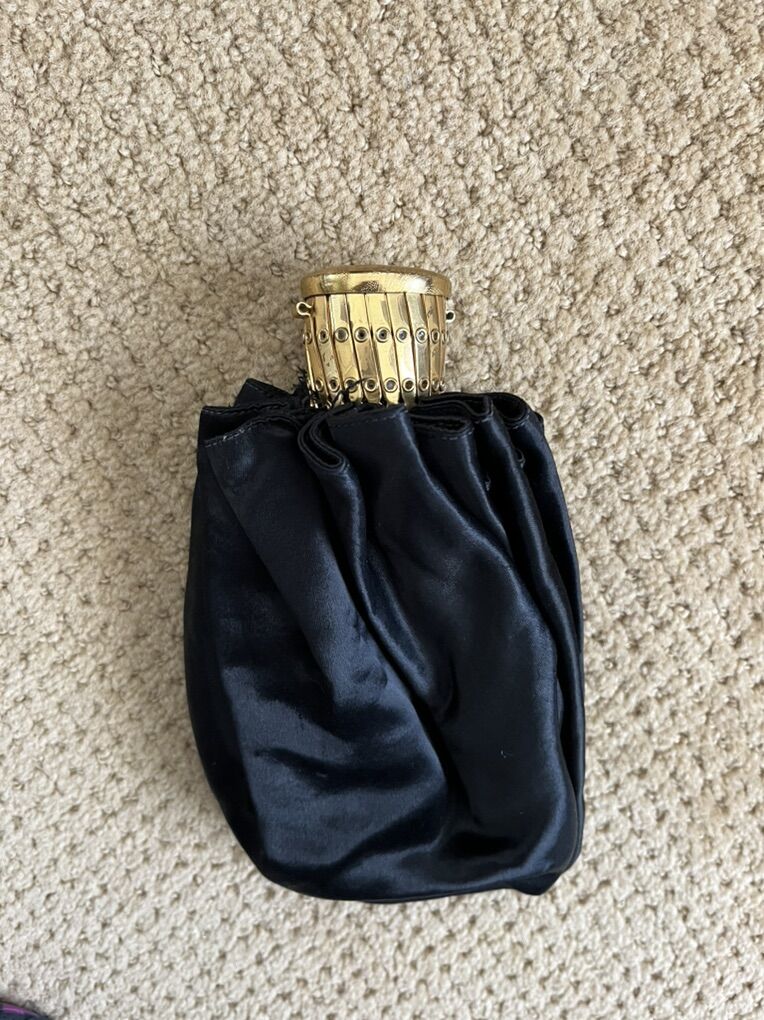 VenmoThis is a unique and fun purse. It is vintage/antique. The gold top has a lid that lifts up and then you can expand the purse. The black is a satin type material. The inside is in nice condtion but I wasn't able to get a good picture of it. There is a tiny wear mark on the outside. Otherwise the purse would be a lot more. This does hold a cell phone nicely. A must see purse. Selling for a parent. Price is firm.