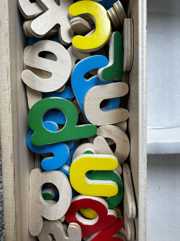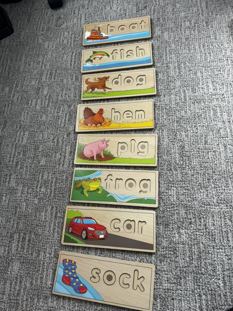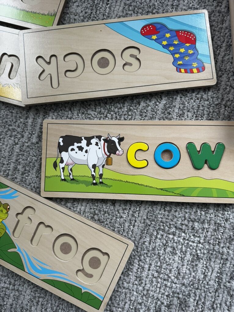 Double sided wooden sturdy puzzles and colorful pieces to help learn letters. Simple words with pictures make learning fun. In excellent condition.