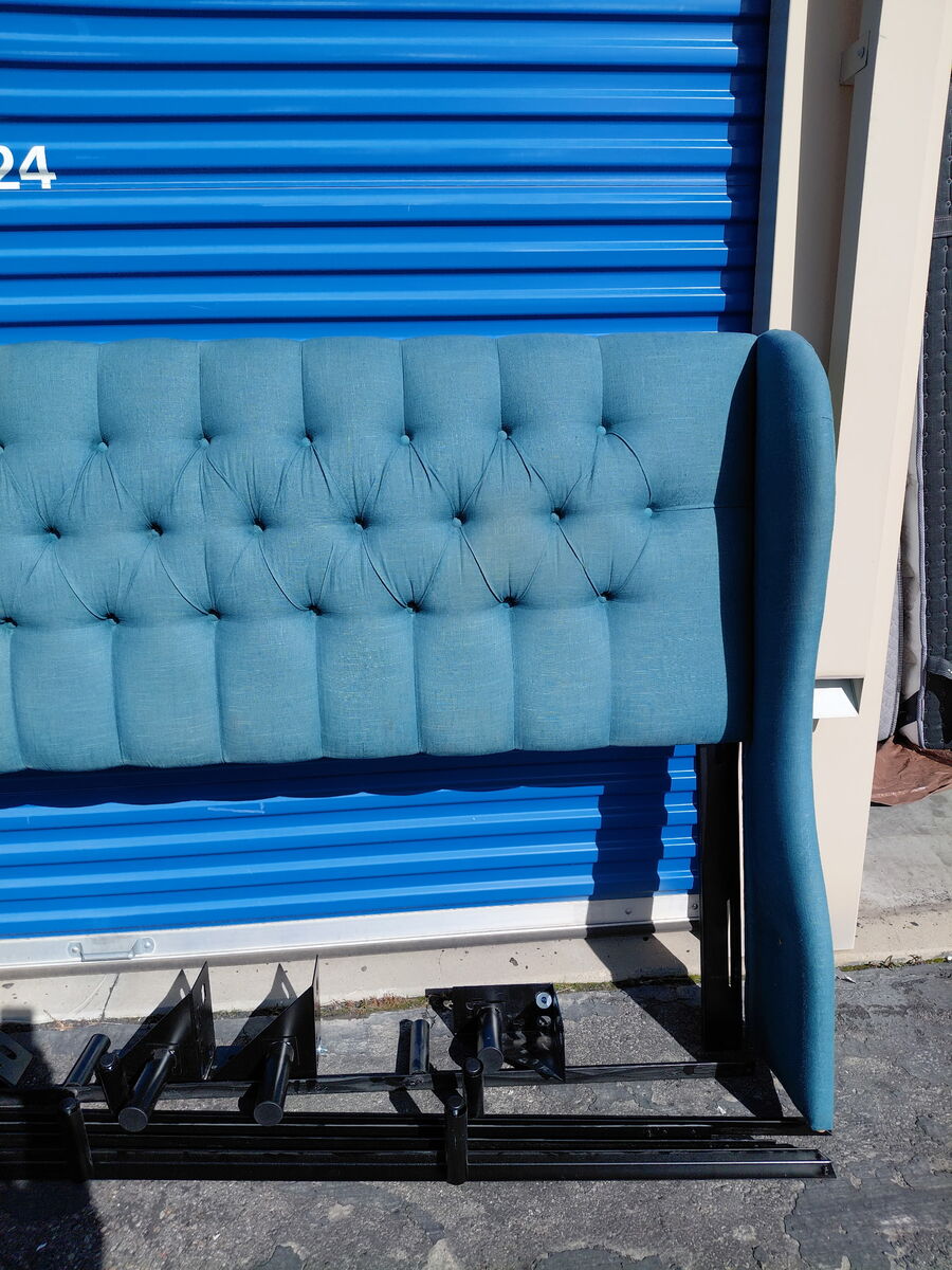 Check out this king upholstered bed. Overall, it is in good condition. There might be some imperfections from moving, a few scratches, and signs of use, etc.