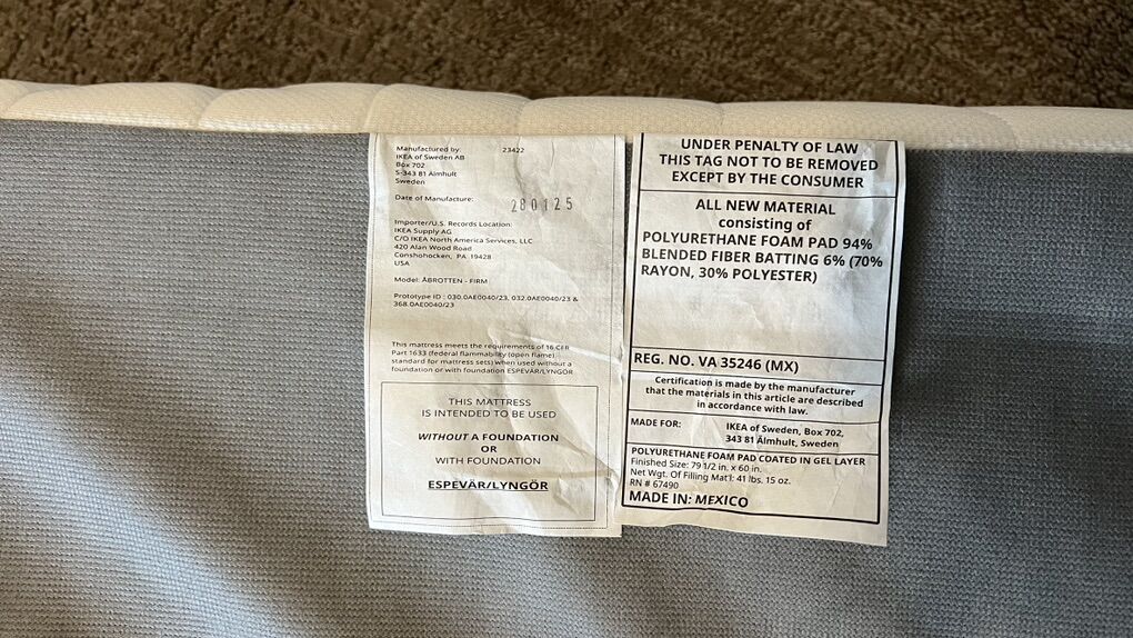 I’m selling an IKEA ABROTTEN Firm mattress, Queen size, in excellent condition. It was used for only 6 months and has no stains, no odors, and no damage.