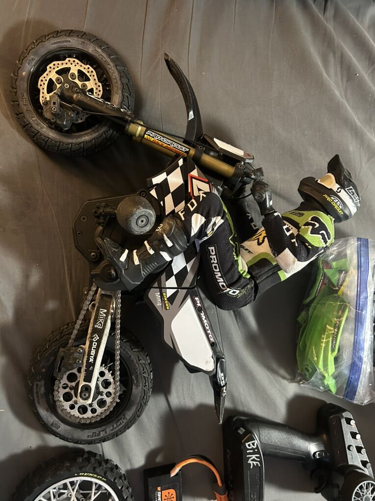 Up for trade or sale is a team Losi promoto MX 1/4 scale RC. Comes with everything shown in pics. 100% ready to run with your own charger. Willing to trade for other RC cars. Please text me at 801-686-7352.