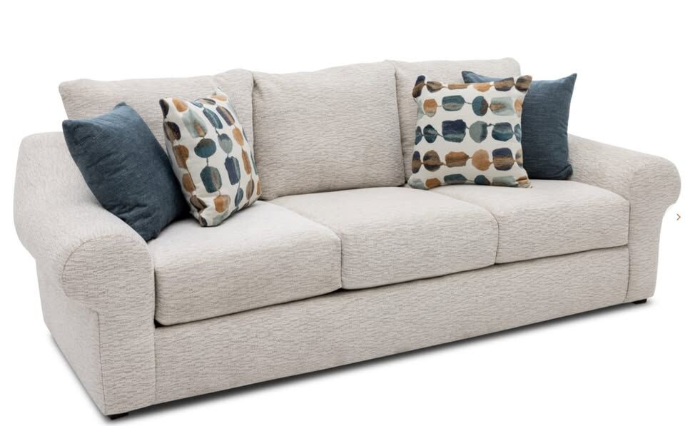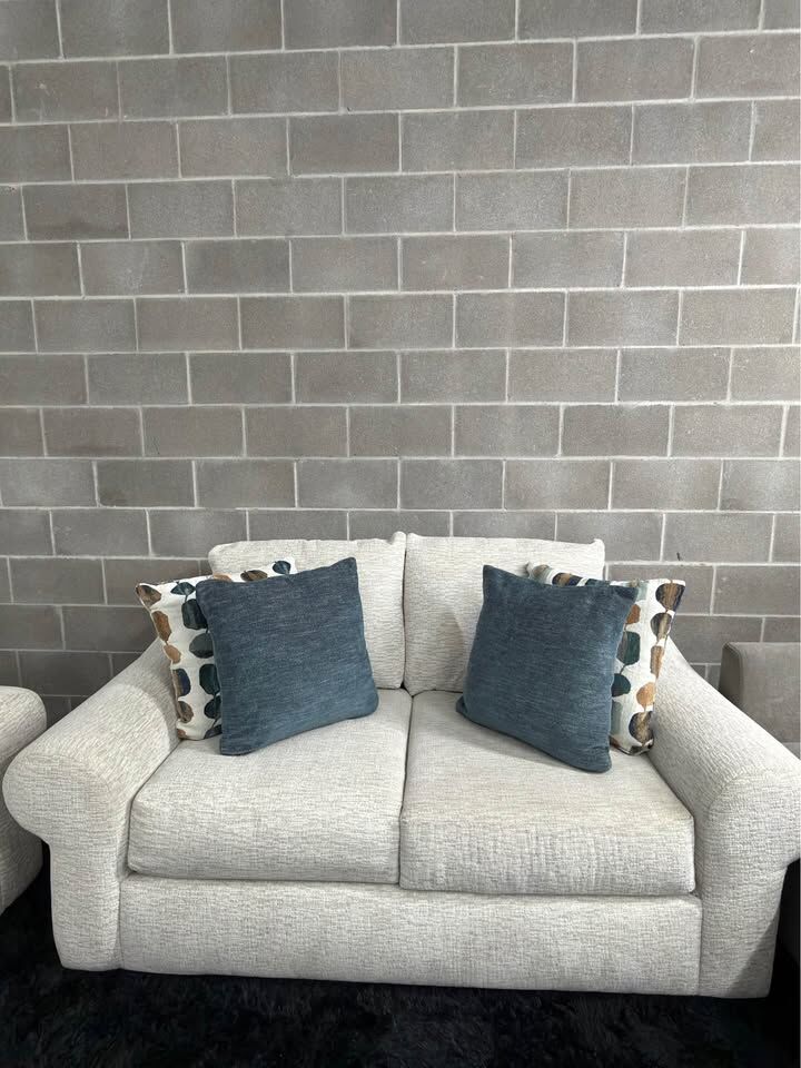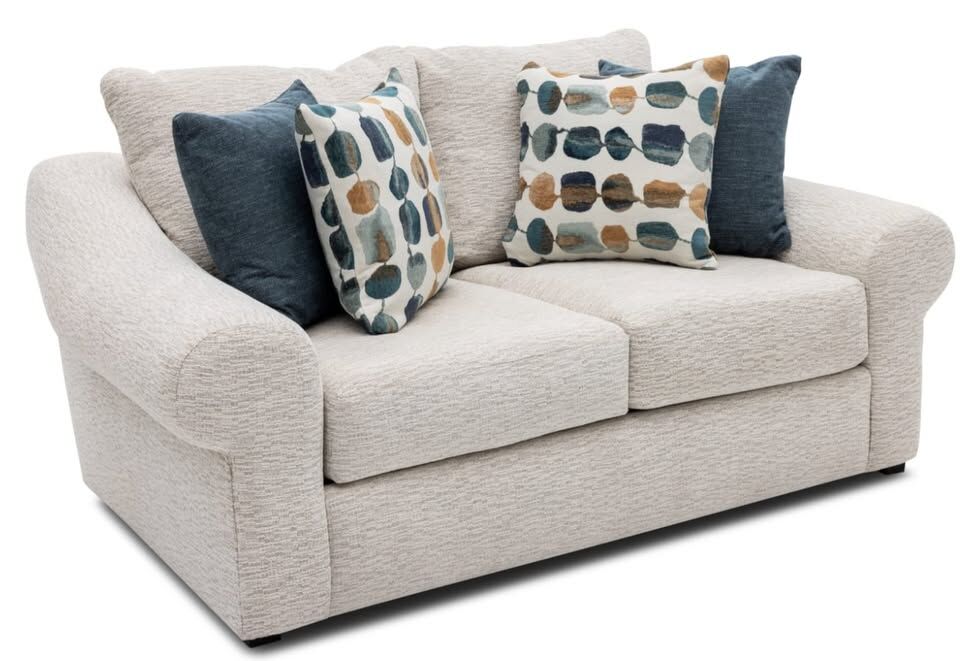 Product Highlights Furniture Row Rialta Collection Sofa + Loveseat Set Deep, comfortable seating Durable textured fabric Neutral ivory color – bright and modern Includes decorative pillows