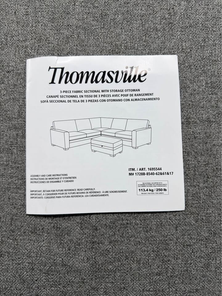 Product Highlights Thomasville quality (Costco model) 3-Piece sectional configuration Storage ottoman included Deep, comfortable seating Modern gray color – neutral and stylish Solid construction – built to last