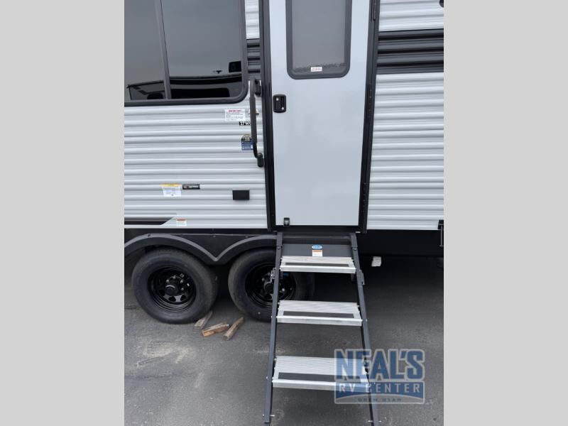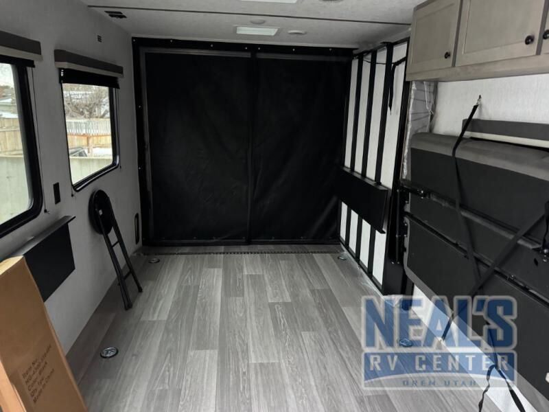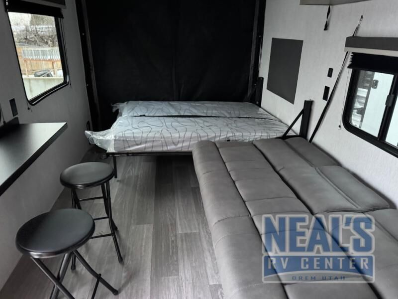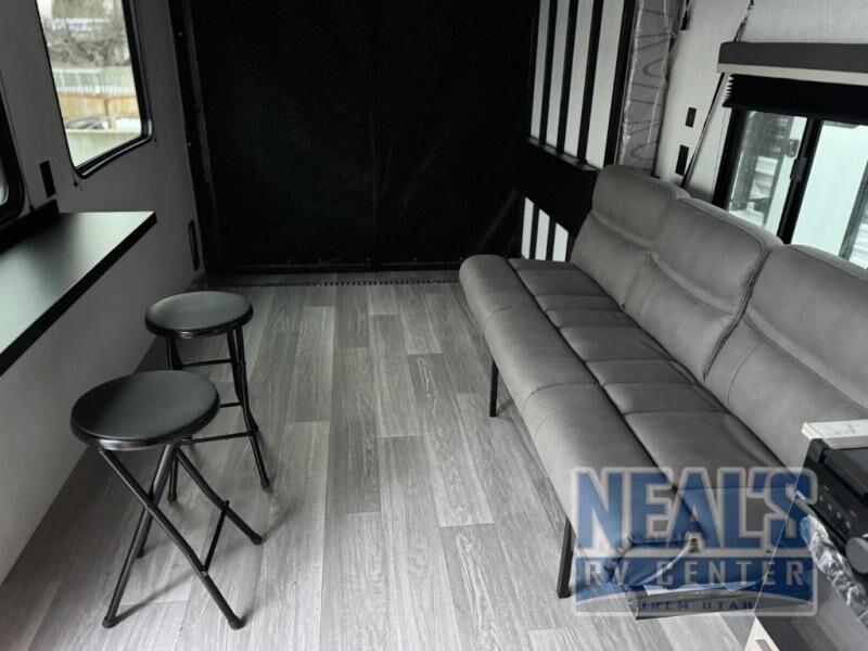 Load up your riding gear and head for the trails in this toy hauler. Once you've unloaded your toys from the ramp door, you can put out the power awning, then head inside to make lunch on the three burner cooktop or in the microwave oven. There is a bartop with stools where you can dine together, plus a sofa to relax. Your guests can sleep on the bed in the garage, while you take the bed in the front bedroom.