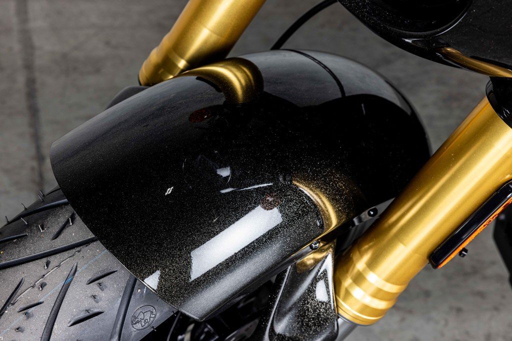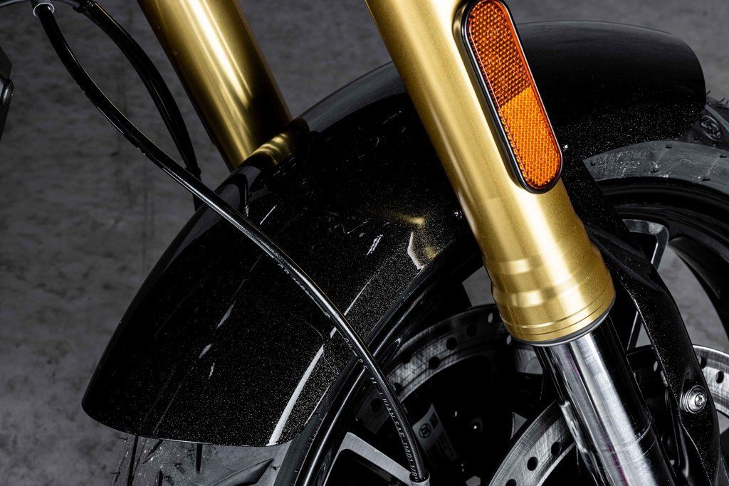 Up top, stylish gloss black 6-inch Moto Style Risers with Machine Highlights, Machined Triples and Moto Handlebars tie it all together, with custom appeal and purposeful ergonomics that fit its aggressive character.