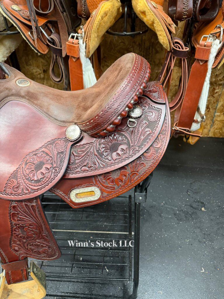 This saddle features a 16" padded leather seat, 7" gullet, FQH bars, 7/8 in-skirt rigging, breast collar dee rings, 3" cantle, dees on back conchos for leather ties if wanted, fleece is good, and weight is around 33lbs.