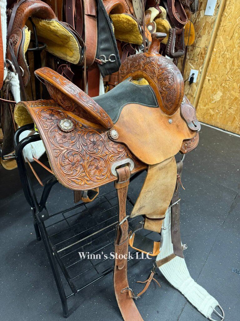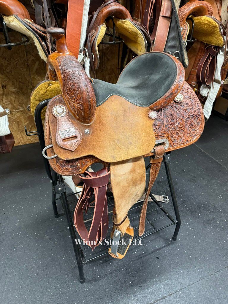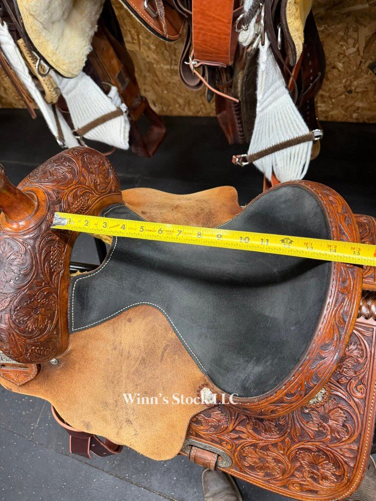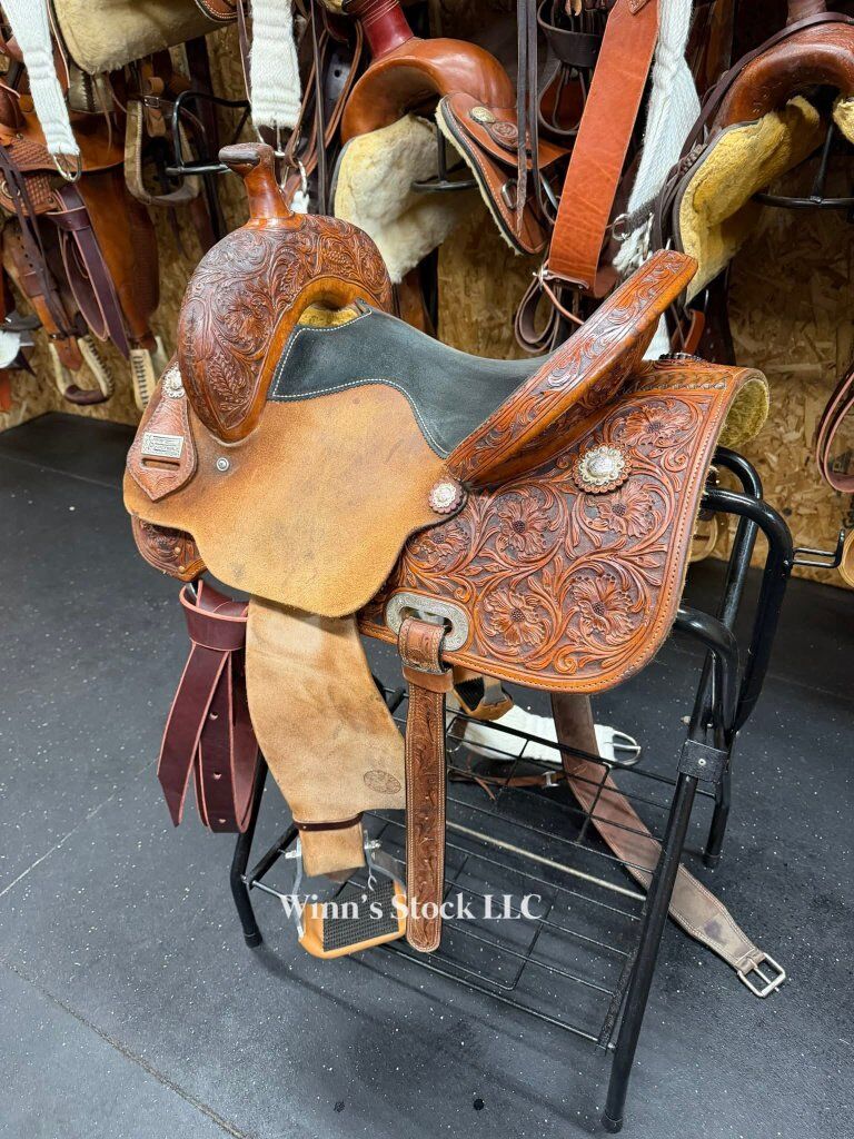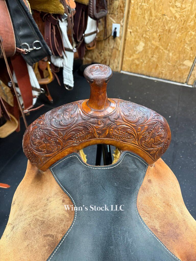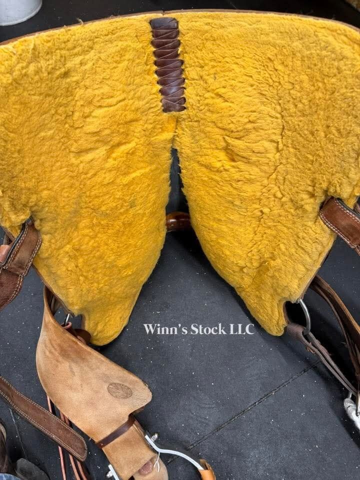 This saddle features a 14" padded suede seat, 4" cantle, 7/8 in-skirt rigging, rough-out fenders, angled stirrups, new front cinch, 6 3/4" gullet, Standard Quarter Horse bars, weight is around 24lbs, and fleece is good.