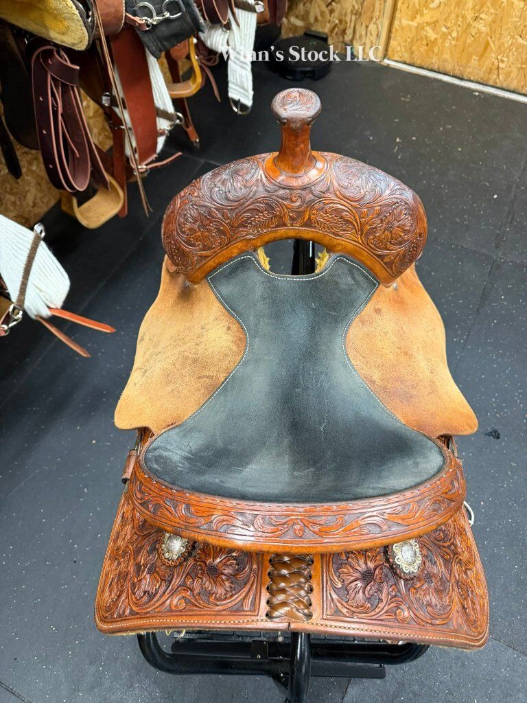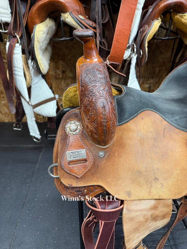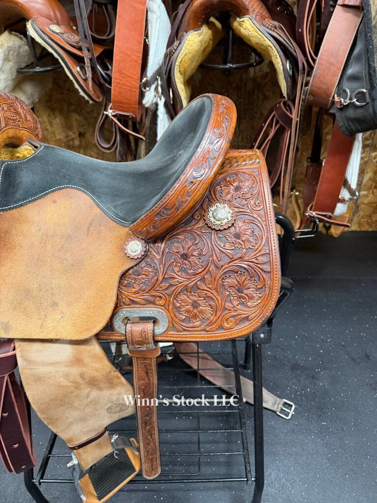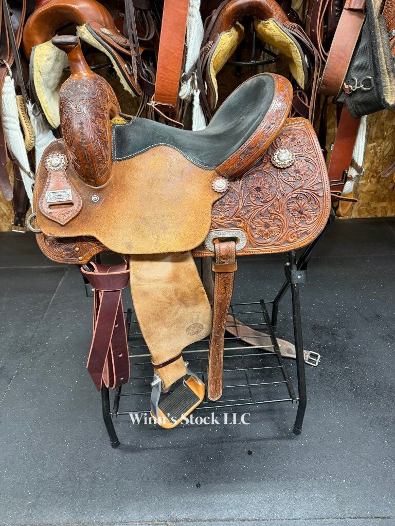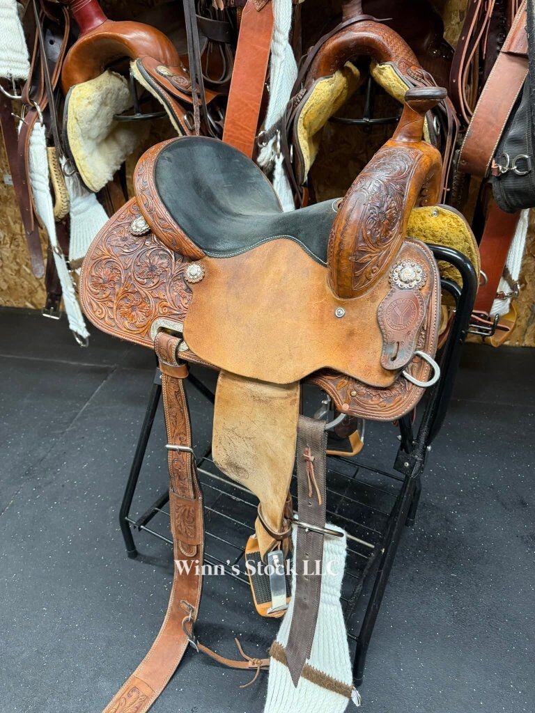 This saddle features a 14" padded suede seat, 4" cantle, 7/8 in-skirt rigging, rough-out fenders, angled stirrups, new front cinch, 6 3/4" gullet, Standard Quarter Horse bars, weight is around 24lbs, and fleece is good.