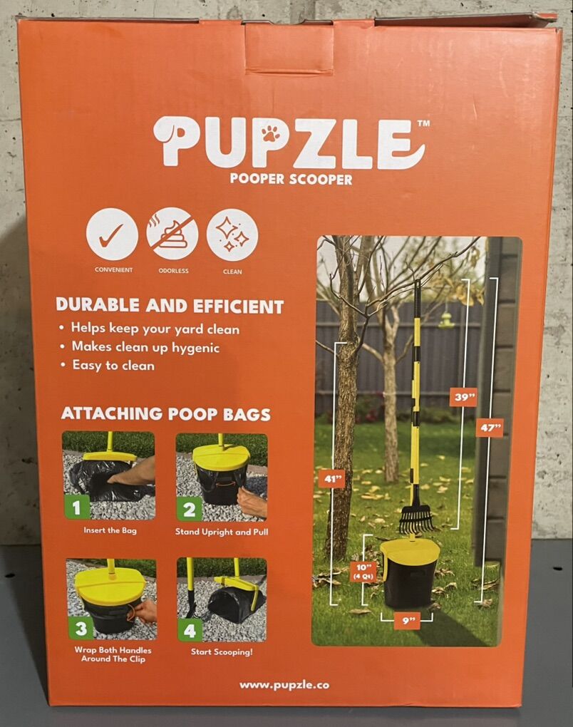 VenmoPupzle pooper scooper, a dog waste removal tool designed to keep your yard clean. Features a 39-inch to 47-inch adjustable handle, allowing for upright cleaning. Utilizes a rake and pan system with an attached bag for hygienic, hands-free waste disposal. Constructed with durable materials for efficient pick-up on grassy or sandy surfaces. Easy to clean and designed to eliminate the need for bending, kneeling, or squatting