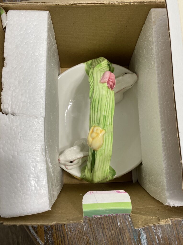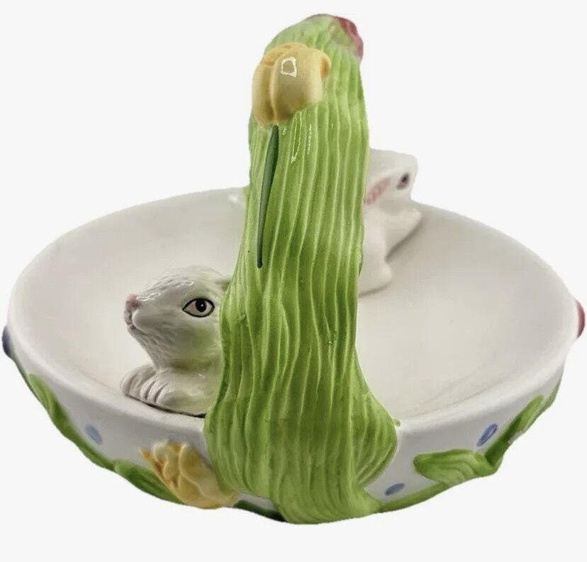 Vintage Easter Bunny Basket Candy Dish Ceramic Bunnies With Flowers. By Aspen Promotion. Smoke free home