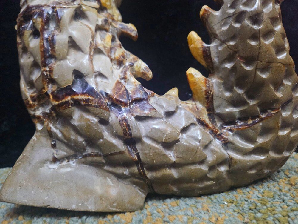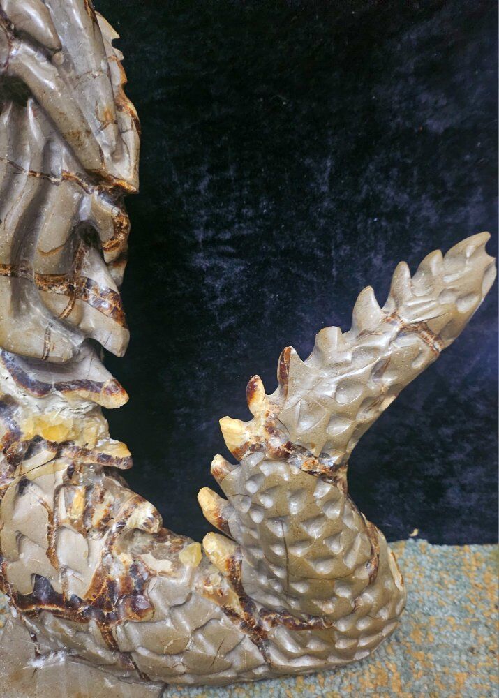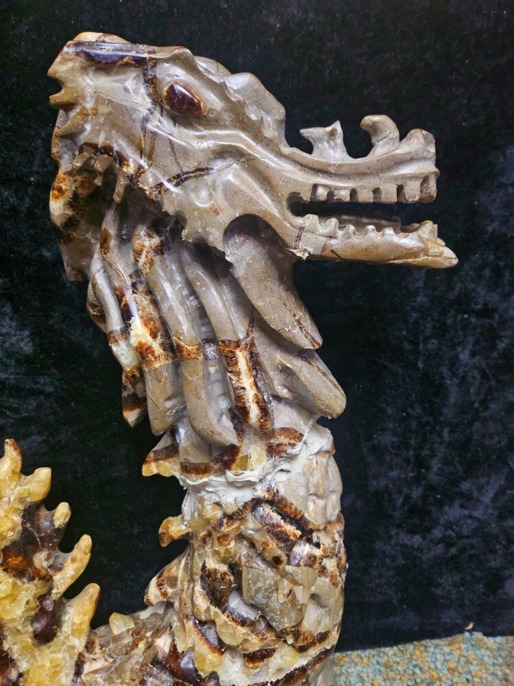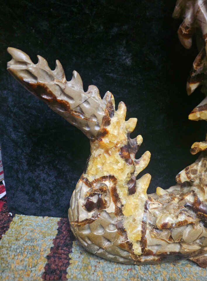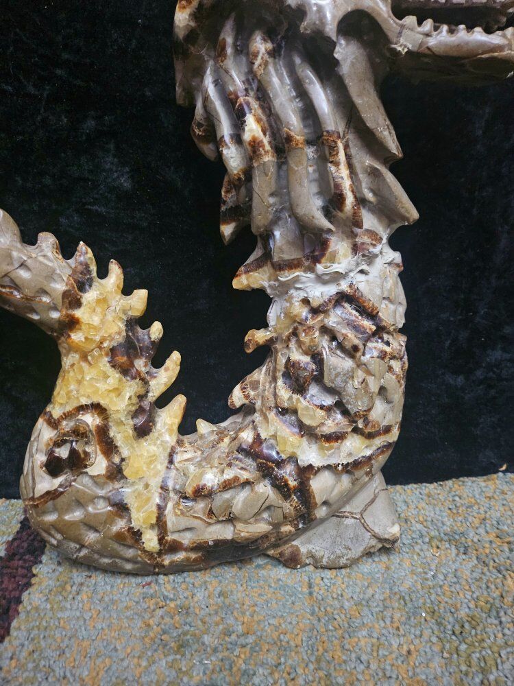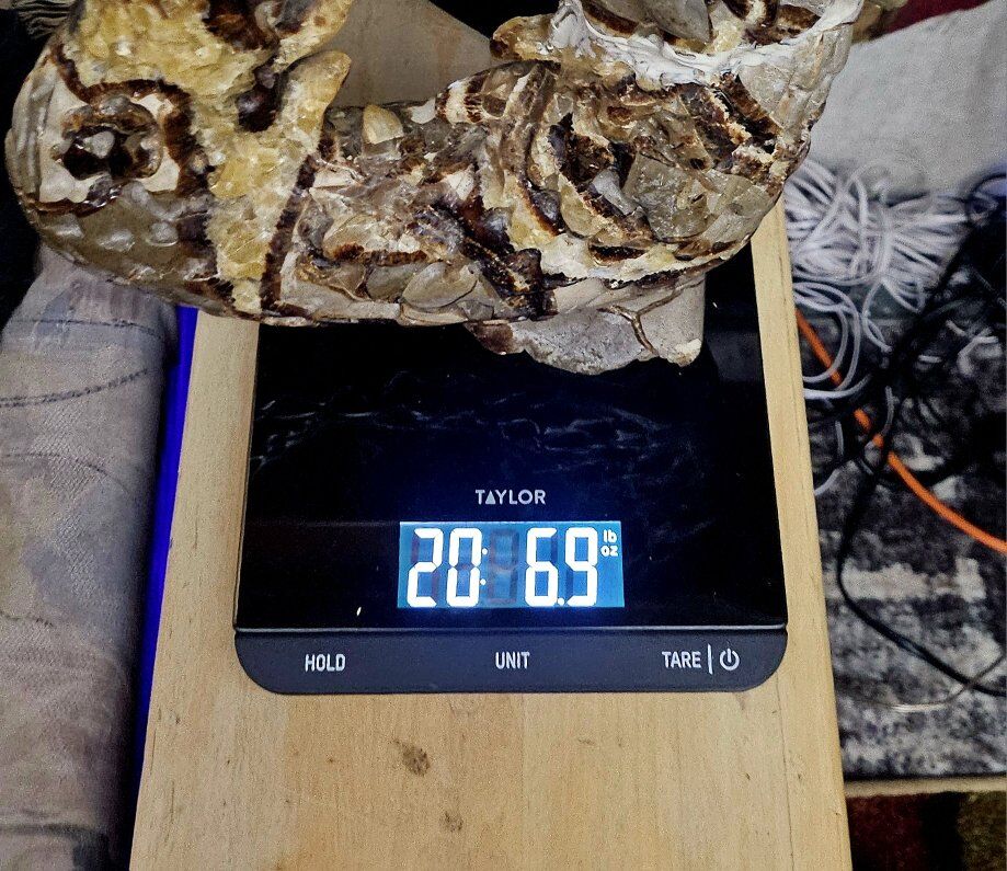 ZelleStunning Large Septarian Nodule (Dragon Stone) - 20 lbs 6.9 oz Up for sale is a massive, high-quality Septarian Nodule specimen. This "Dragon Stone" features incredible natural geometry with vibrant yellow calcite crystals and dark brown aragonite veining set against a rugged limestone matrix. This is a heavy, substantial piece perfect for a fireplace mantle, bookshelf, or as a centerpiece in a mineral collection. Details: Weight: 20 lbs 6.9 oz (as shown on scale) Type: Septarian Nodule / Dragon Stone Condition: Natural/Raw with visible crystal pockets. Origin: (Add location if known, e.g., Utah, USA) Shipping Note: Due to the significant weight of over 20 pounds, this item will be packed with extreme care using heavy-duty cushioning to ensure it arrives safely.