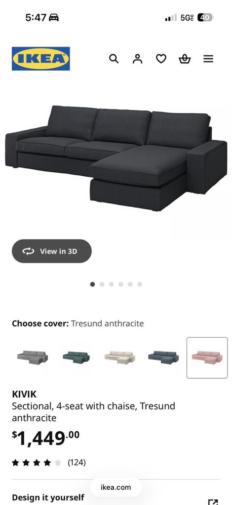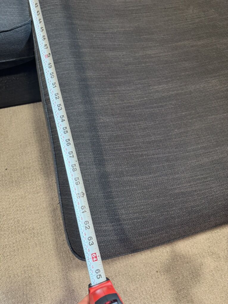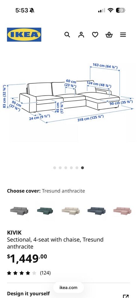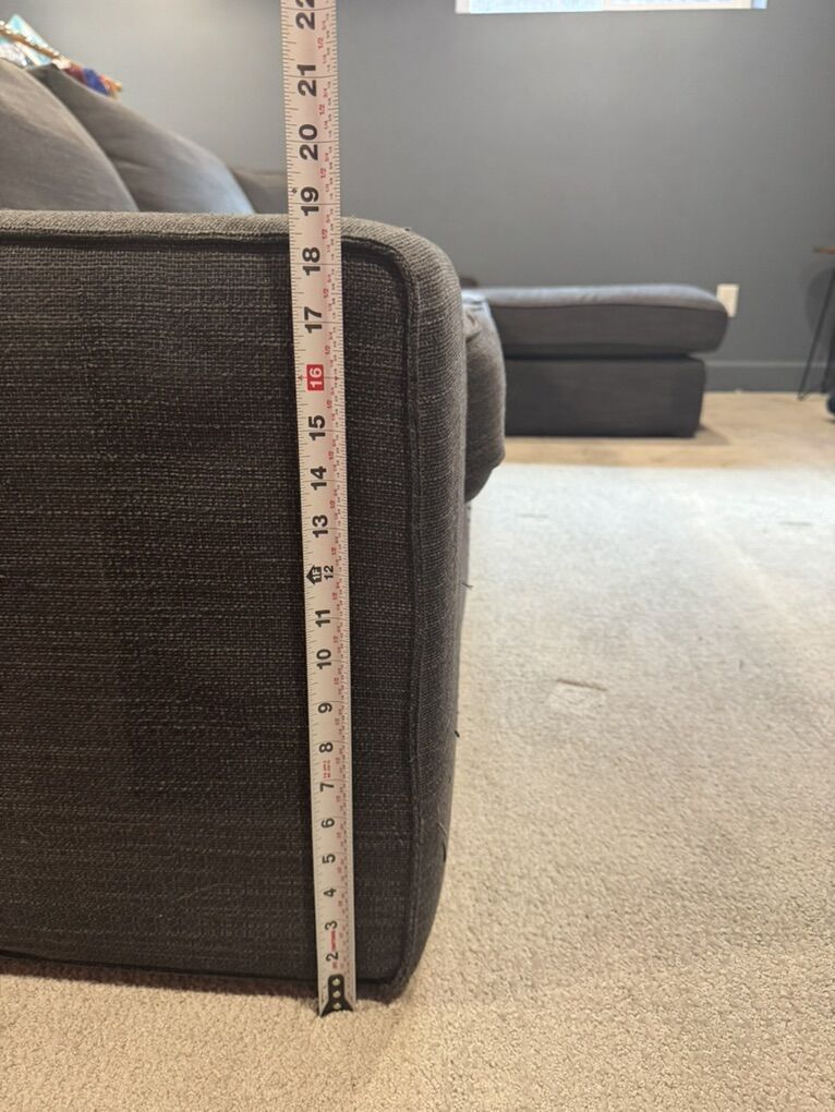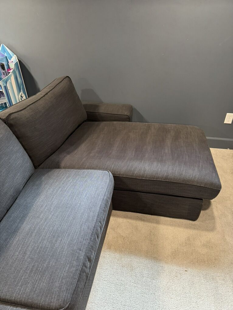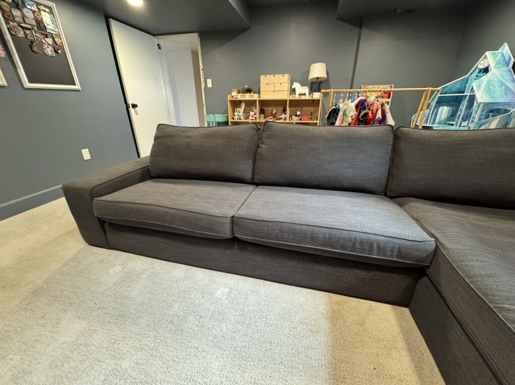 This is the IKEA Kivik sectional couch in dark gray. Selling new at IKEA for $1449. Priced to sell and very motivated to get it out of our house! The covers are removable and washable. This is the large 4 seater couch with the chaise, not the loveseat with the chaise. Measurements are in photos in the listing. This has been down in our theater and rarely used. Pet and kid friendly, smoke free home. One back corner has some fabric pulls from our kitty. If it is against a wall you won’t see it. The cover is completely replaceable though and it would be basically brand new!