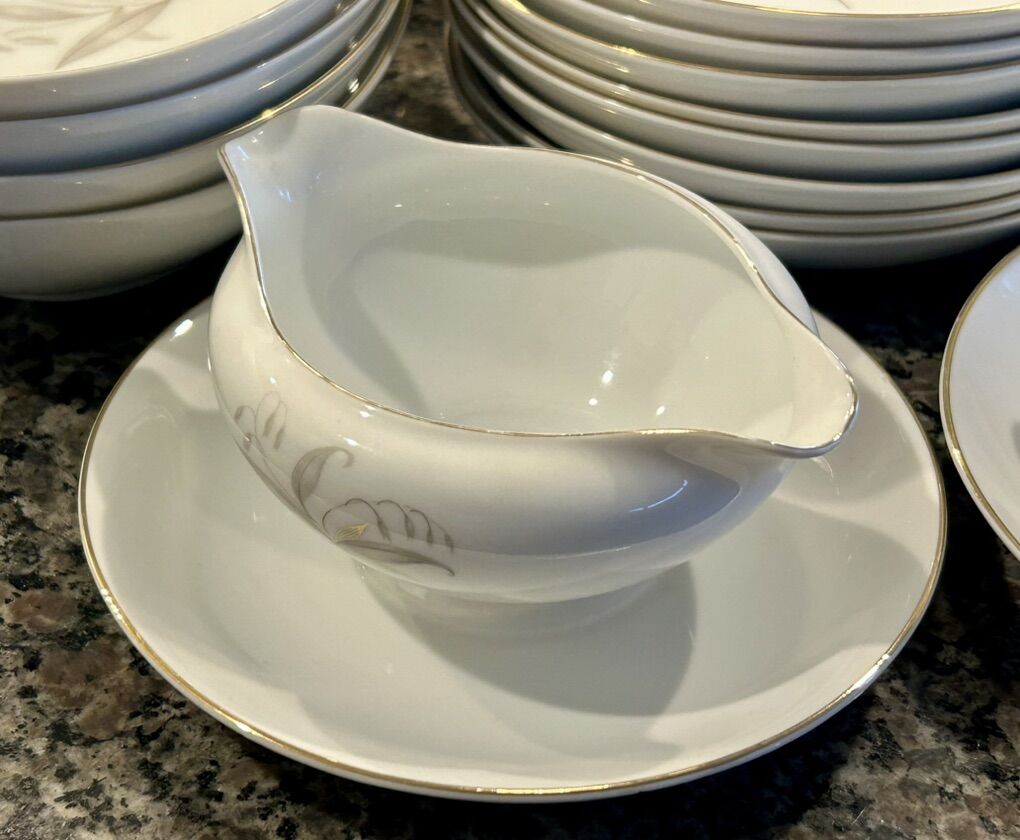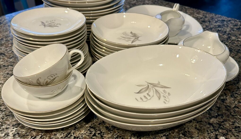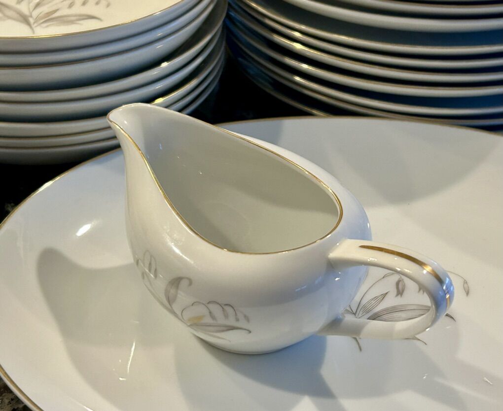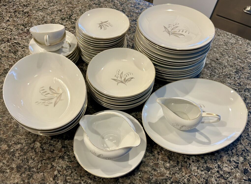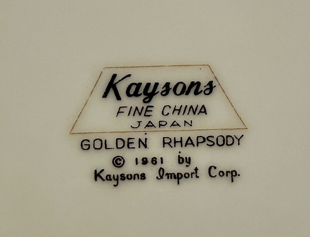 VenmoLot of 53 pieces. Kaysons fine china Golden Rhapsody pattern Most are in excellent condition there are some salad & dinner plates that have some ware 15 dinner plates 15 salad plates 8 bowls 6 tea plates 2 tea cups 1 gravy boat with attached plate 1 gravy boat 4 oval serving dishes 1 oval serving platter