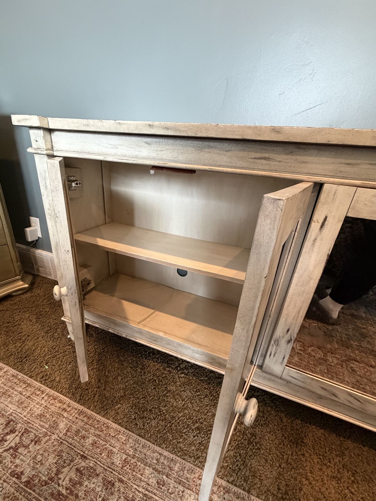 VenmoBeautiful solid wood console. Has opening for chords in the back if you needed it to be a media console. Doors work and mirrors are intact. 64” long 12” deep and 34” tall.