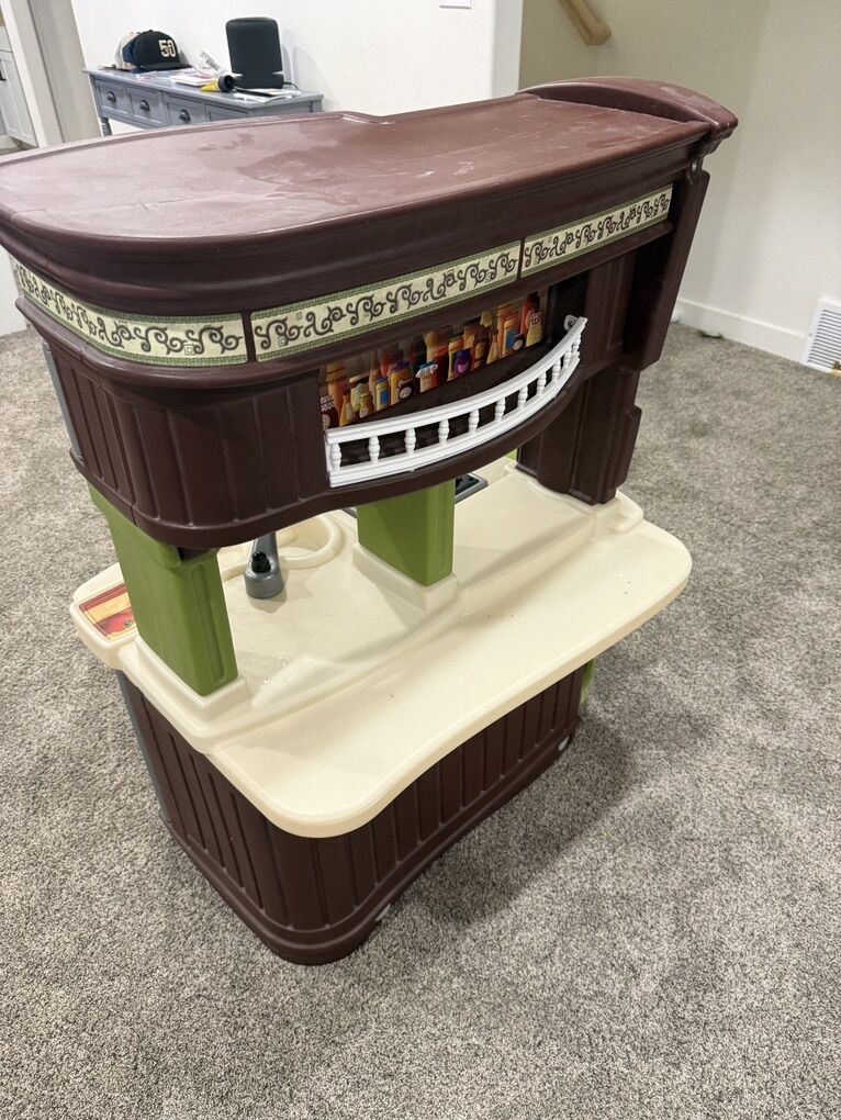 Includes: • Play kitchen with stove, oven, microwave, sink, and storage • Refrigerator and shelving • Chef hat and apron • Oven mitt • Metal pots, pans, and colanders • Plates and bowls • Wooden and plastic play food (fruits, veggies, bread, watermelon, etc.) • Baking tray with cookies • Utensils and serving tools The kitchen is in great used condition and very clean. All pieces shown in photos are included. Perfect for toddlers and young kids who love pretend play. Smoke-free home. Cash or Venmo. Message me with questions!