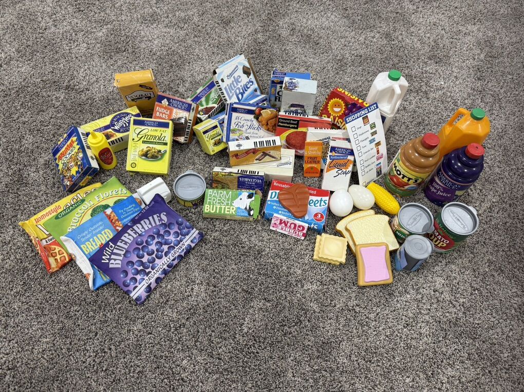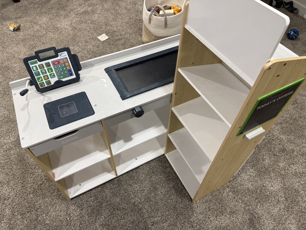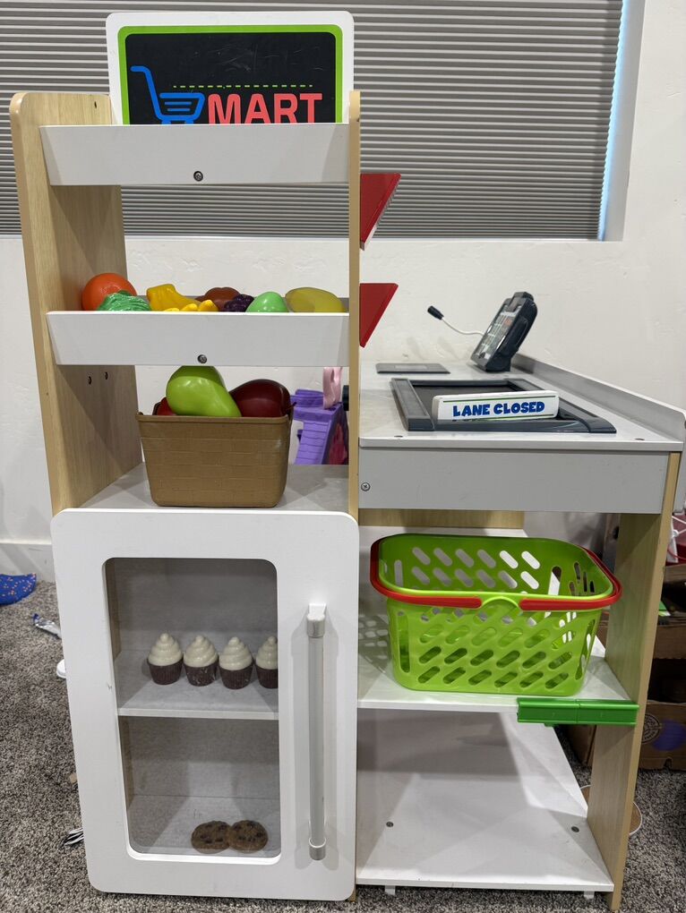 VenmoSuper fun wooden play grocery store stand with checkout area and shelves for stocking all the food. Perfect for imaginative play, learning about shopping, counting, and taking turns! Includes: • Wooden grocery store stand with shelves • Checkout counter with register • Plenty of storage space • Large assortment of play groceries (milk, juice, fruits, vegetables, and more) Everything is in good used condition and ready for play. Very sturdy and great quality. Optional: Add the shopping cart for an extra $5. Smoke-free home. Cash or Venmo. Message me if interested!