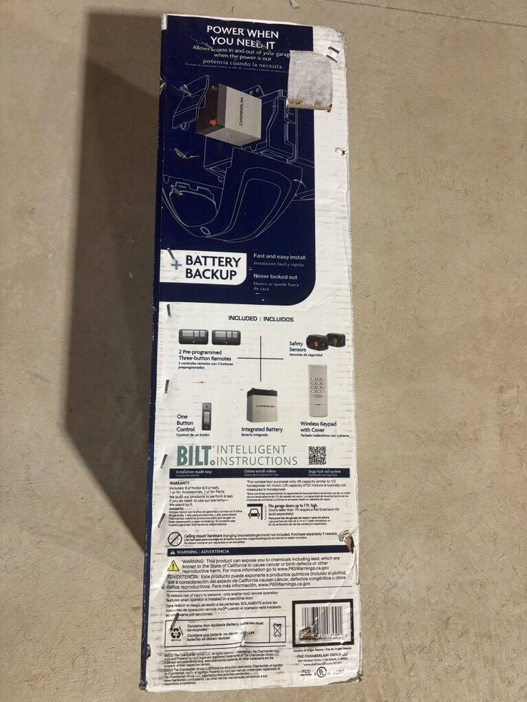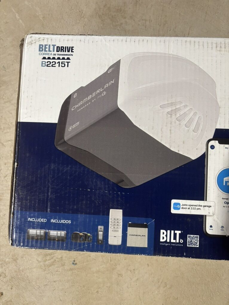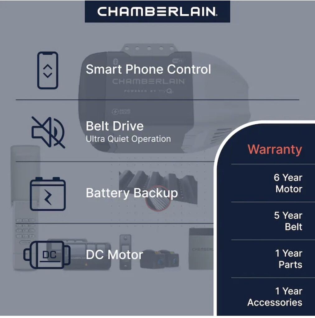 Description- 1/2 HP myQ Ultra Quiet Smart compatible belt drive garage door opener with battery backup. See photos for more product information and specifications.