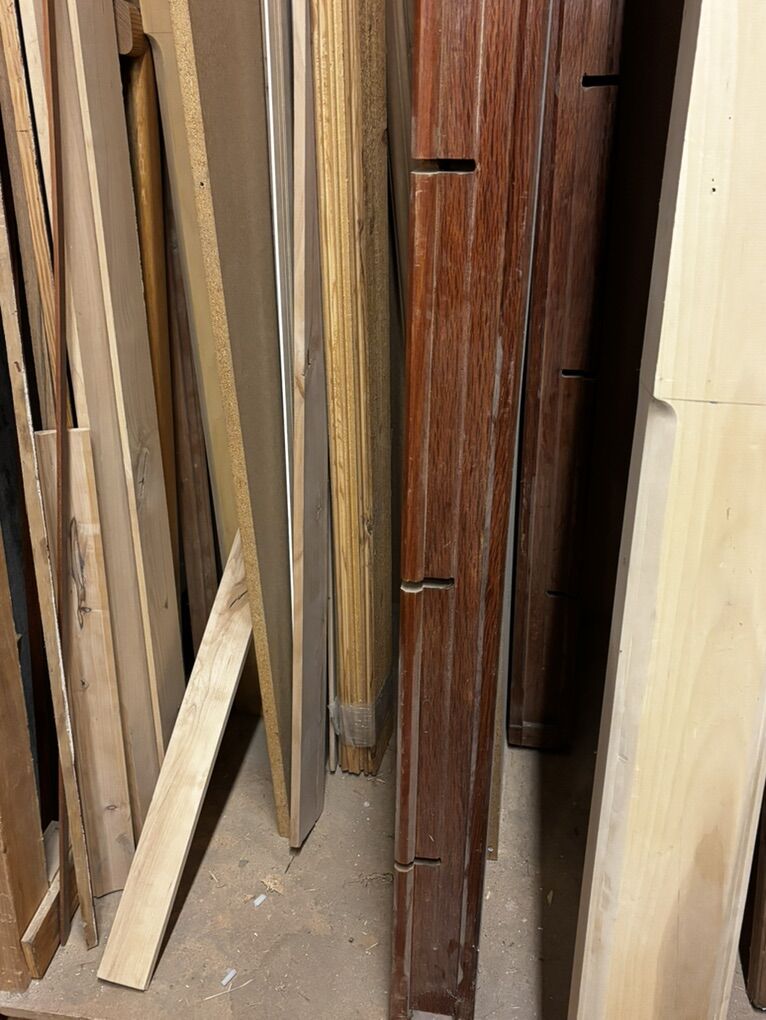 Description: Selling a large lot of assorted wood and lumber. Includes solid hardwood pieces (looks like oak and other hardwoods), trim boards, framing pieces, and various lengths of project wood.