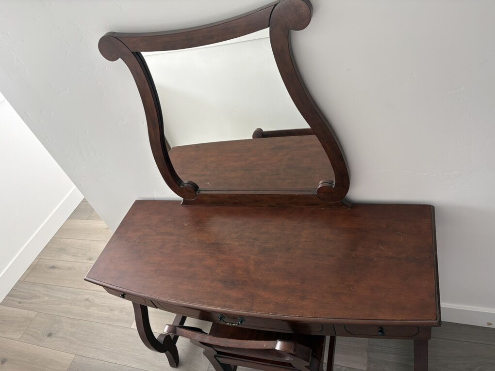 VenmoBeautiful solid wood vanity set in a rich cherry finish. Includes vanity with attached mirror and matching chair. Classic curved details and timeless design make it perfect for a bedroom, guest room, or getting-ready space.