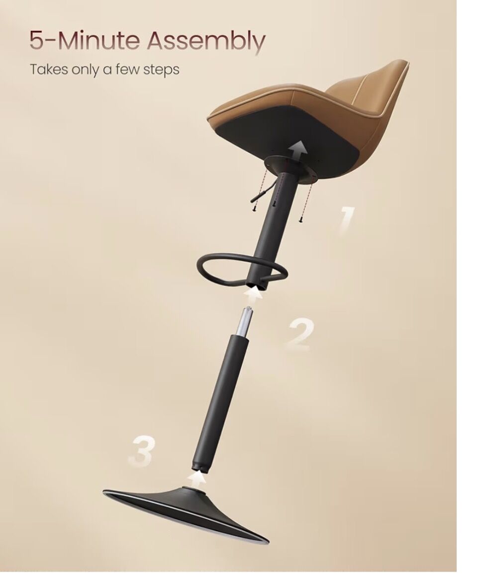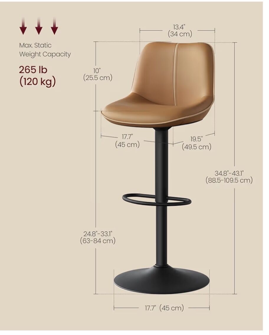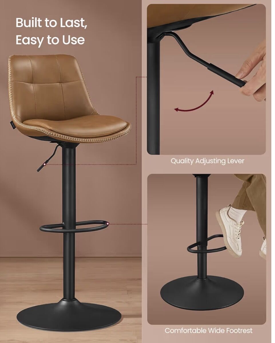 perfect adjustable height (24"-30") adapts to any setup.. smooth hydrolics, cushioned seat with foot rest help to customize to your specifics. Simple to wipe clean and look fab. See photos of all the specifics!!