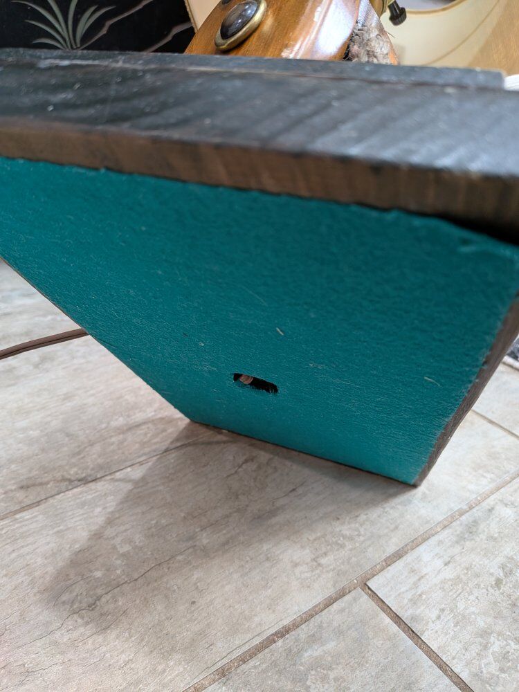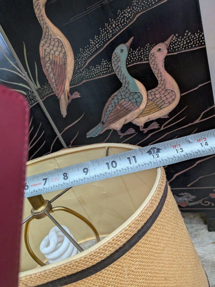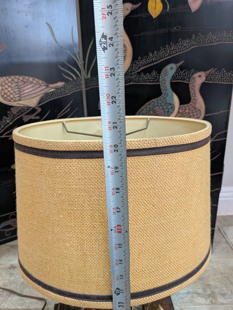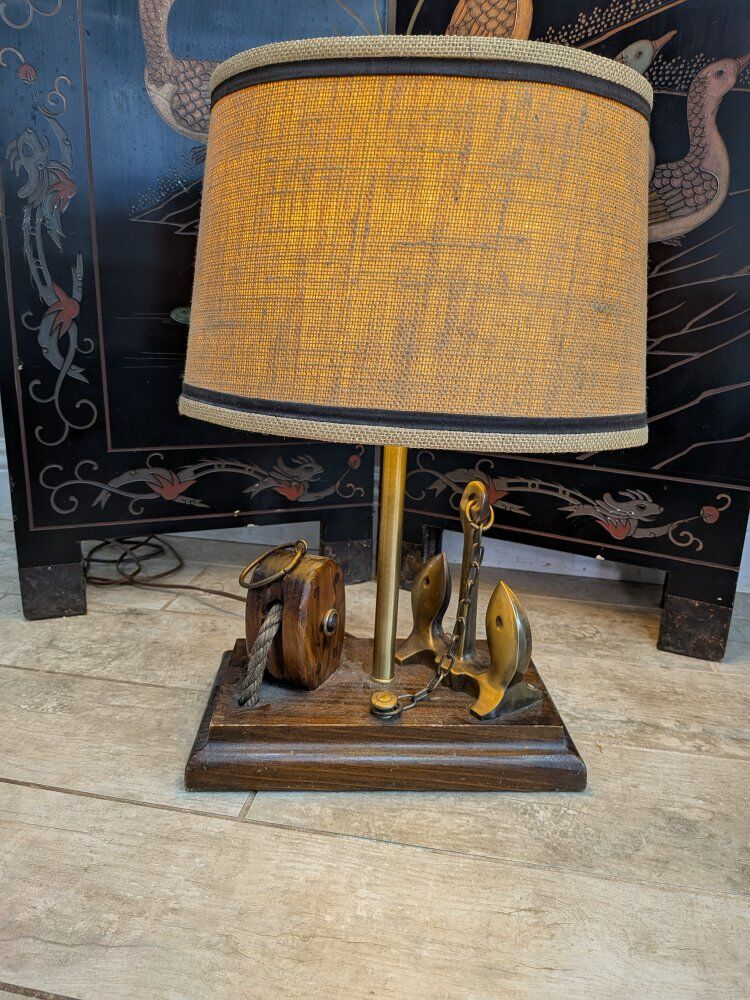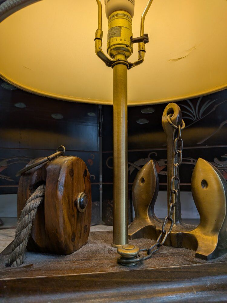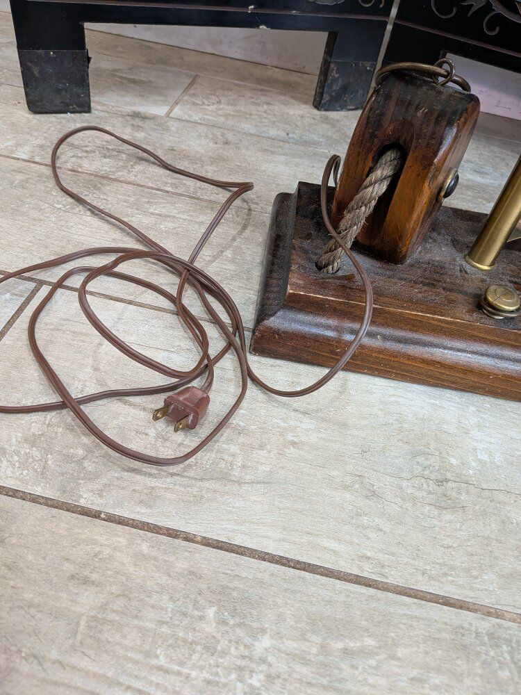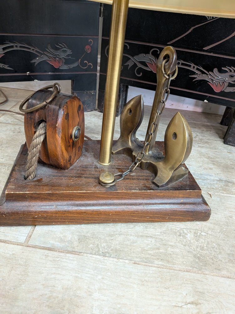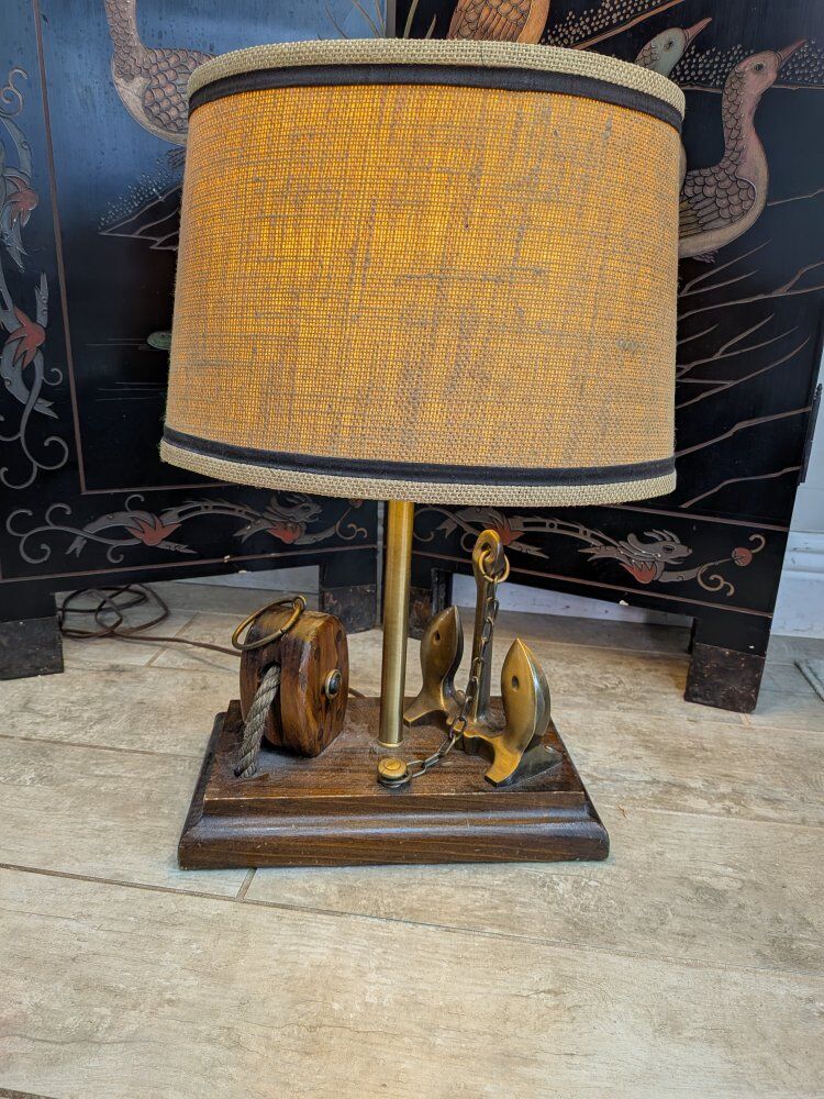 Vintage maritime nautical table lamp features a wooden base with a pulley and brass anchor details, topped with a burlap shade. $125 obo.