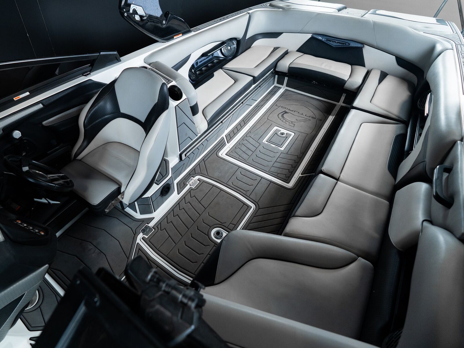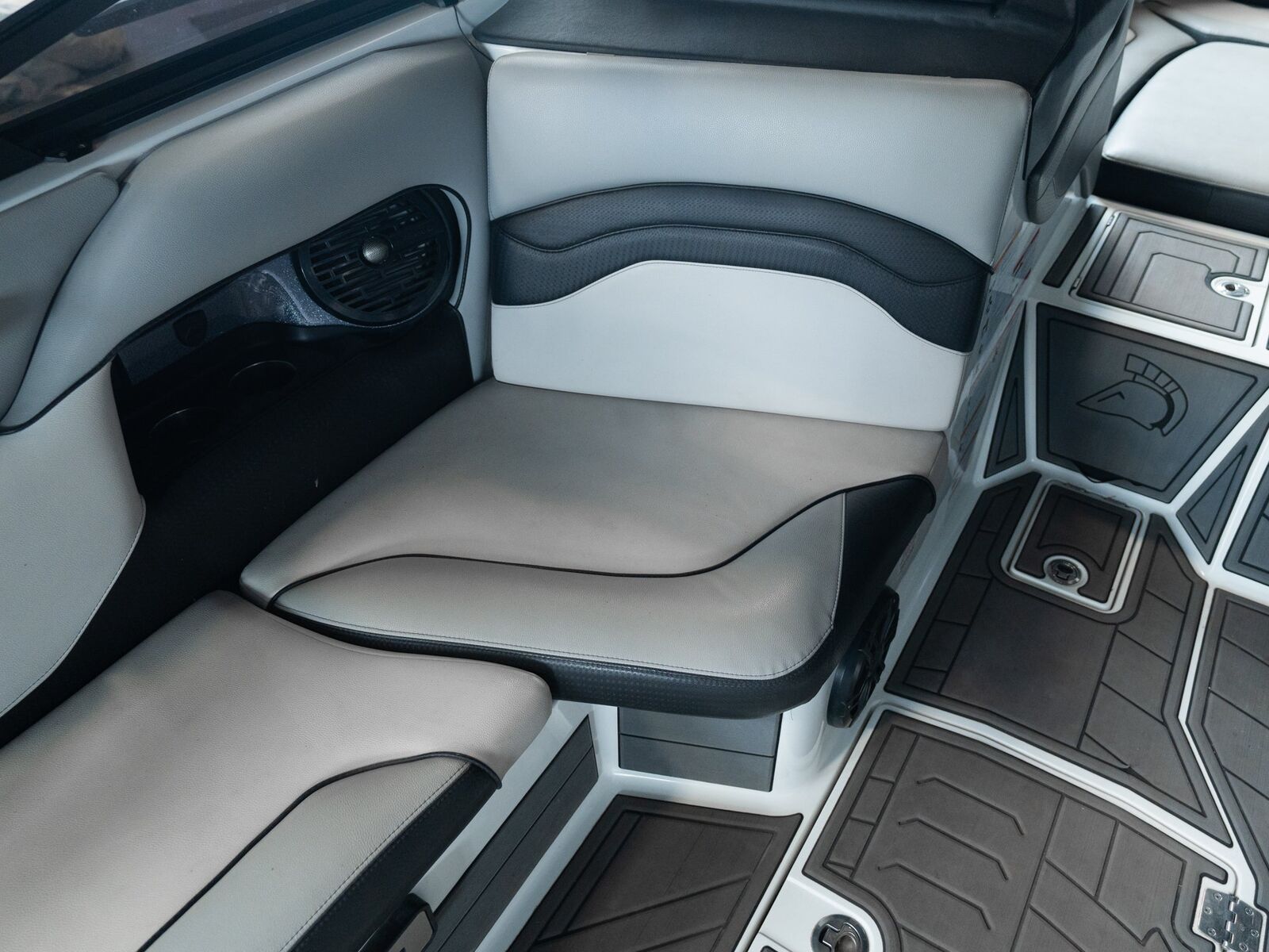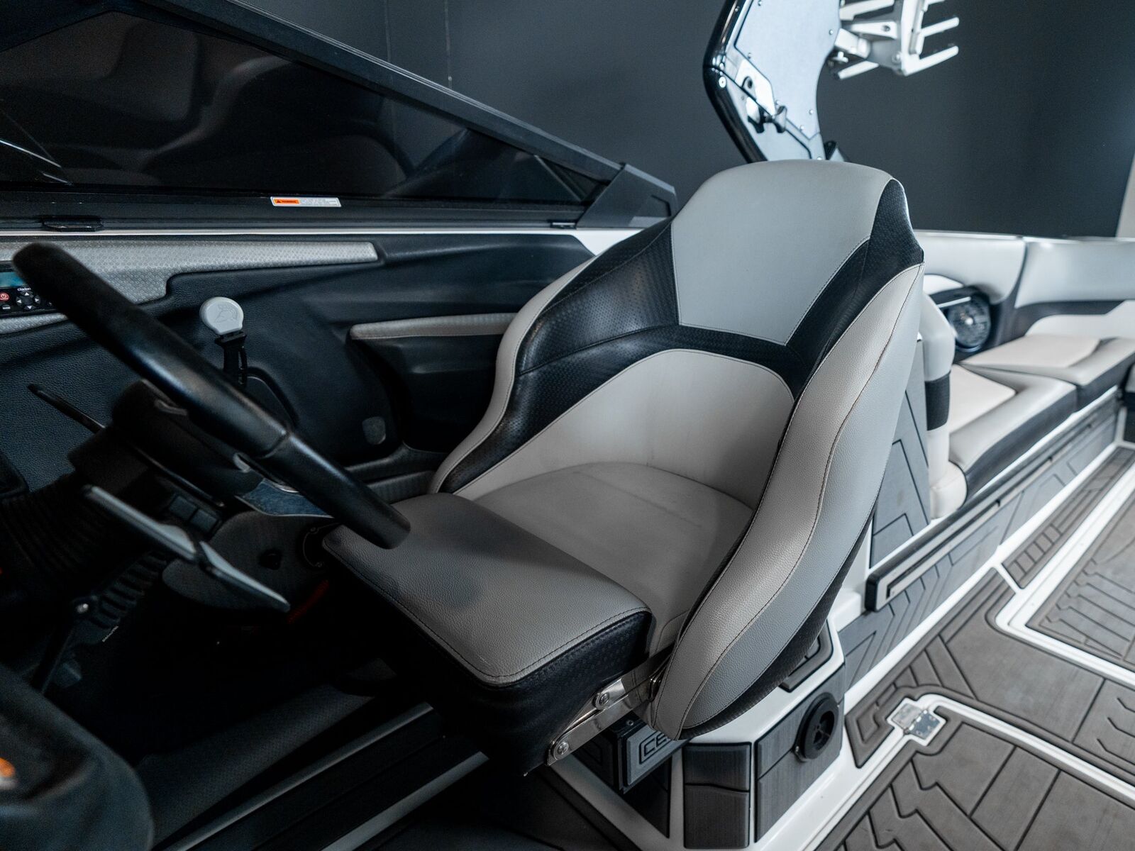 Finished in a sharp gray/black exterior with a clean, modern interior, this boat has a premium look that stands out without being loud. The vinyl, flooring, and gelcoat are in excellent condition, and the deep cockpit gives everyone a comfortable, secure ride.
