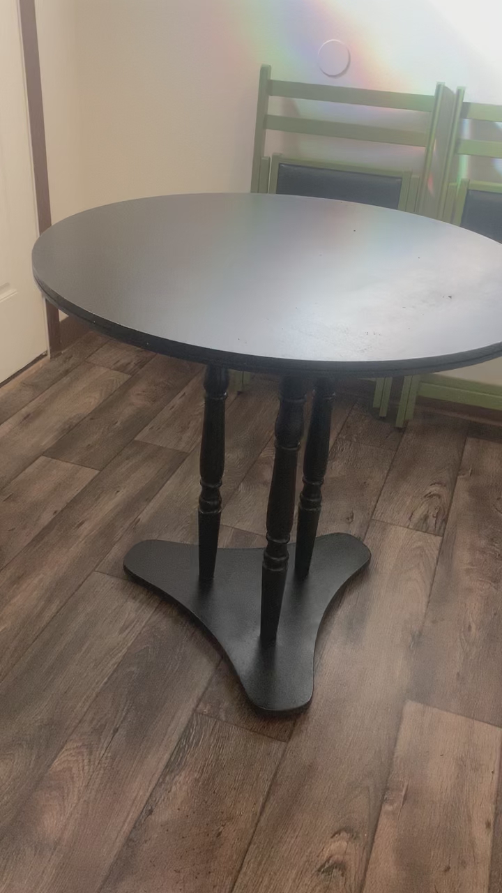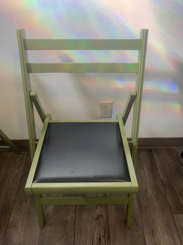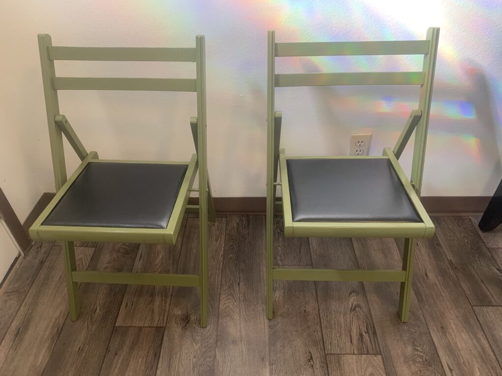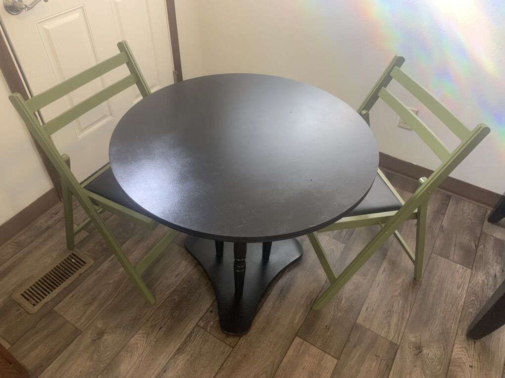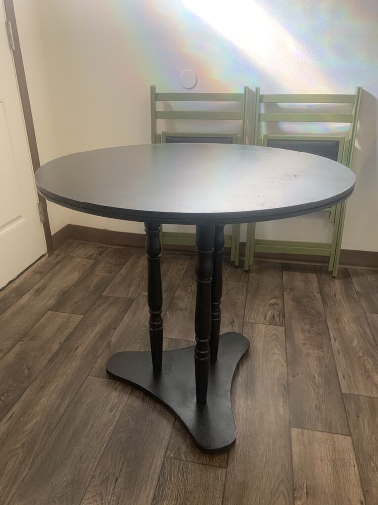 VenmoSolid wood table with 2 darling wood and faux leather folding chairs. Beautiful set Table is 29 in tall 30 in round Chairs 18 in from floor to seat 18 in wide Can deliver Shoot me a text