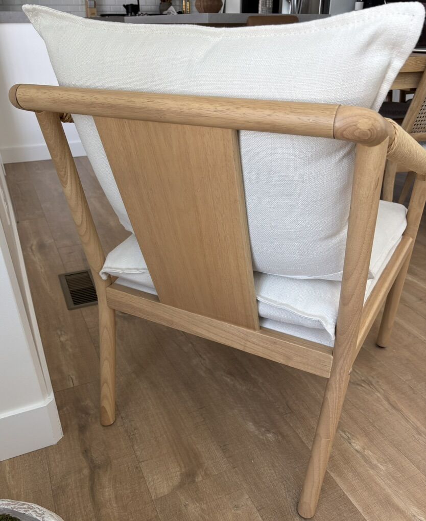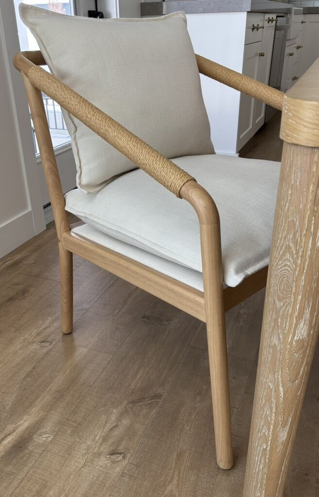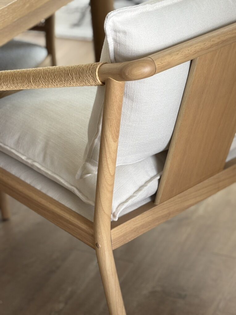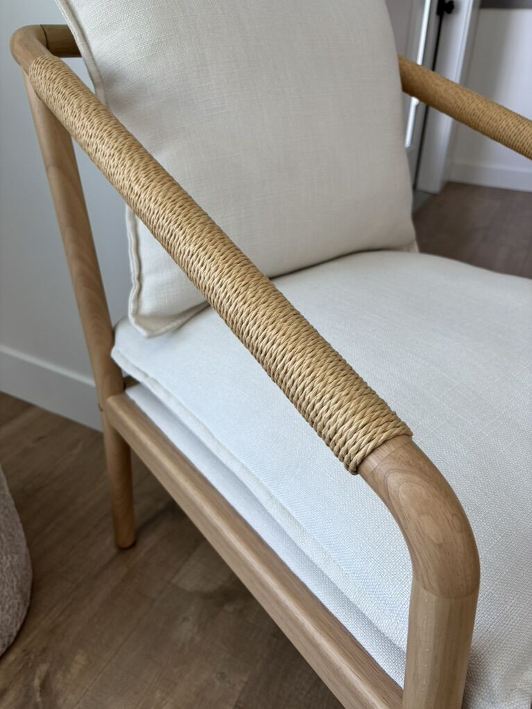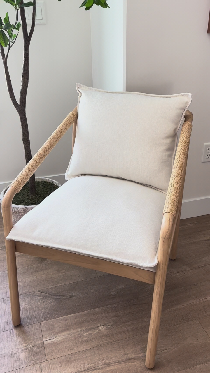 The natural wood frame features sleek, rounded arms with that signature wrapped detail, paired with soft, plush white/cream upholstery for cozy comfort (removable cushions). Perfect for a living room, bedroom nook, reading corner, or entryway—adds instant elevated, California-cottage style.