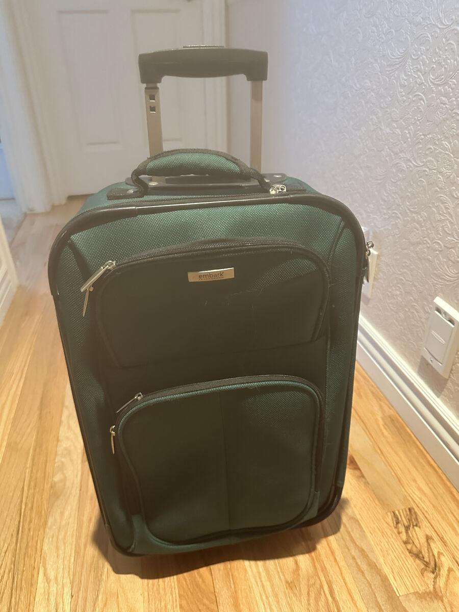VenmoGreen Carry On Luggage, size is 21" high, 13" wide, and 7 1/2" deep. Great color you easily find at baggage claim. Like new - don't remember ever using this piece.