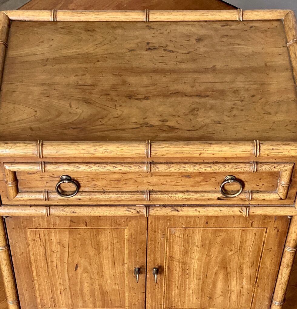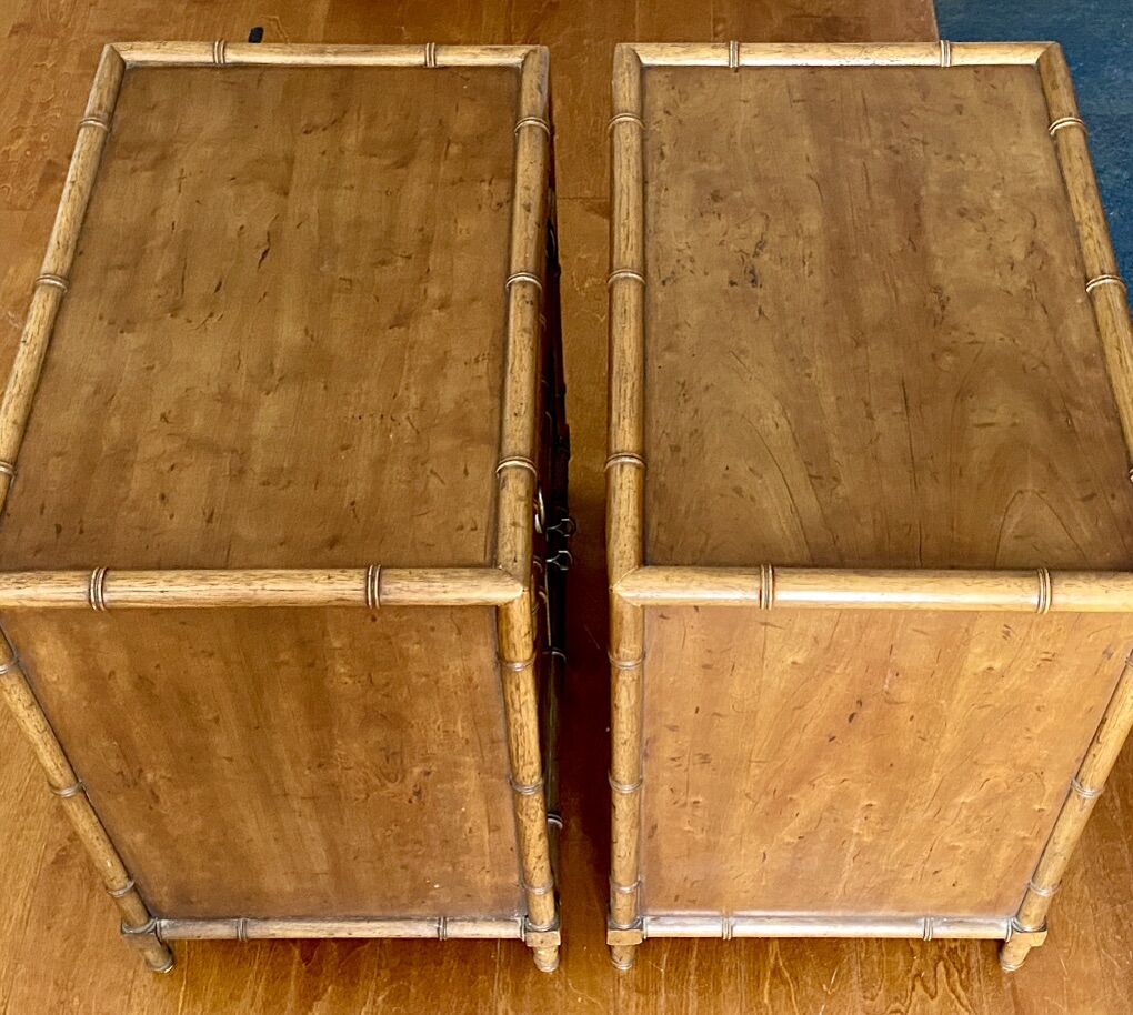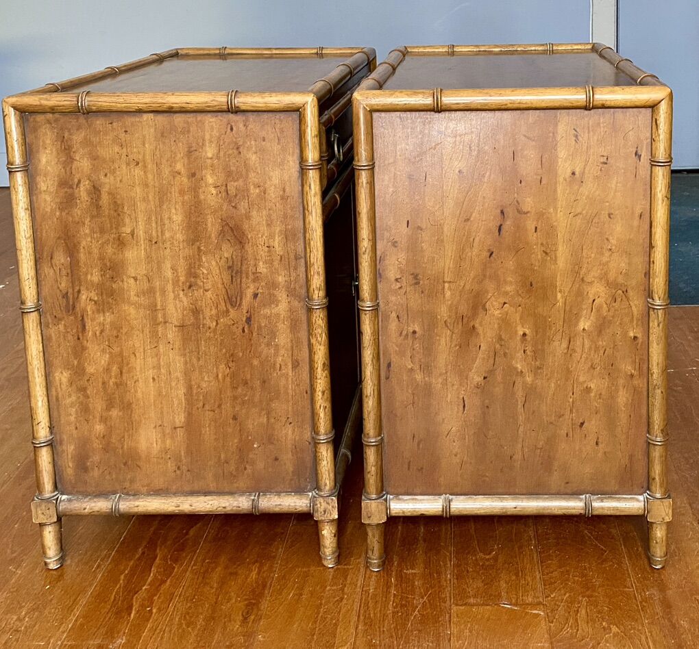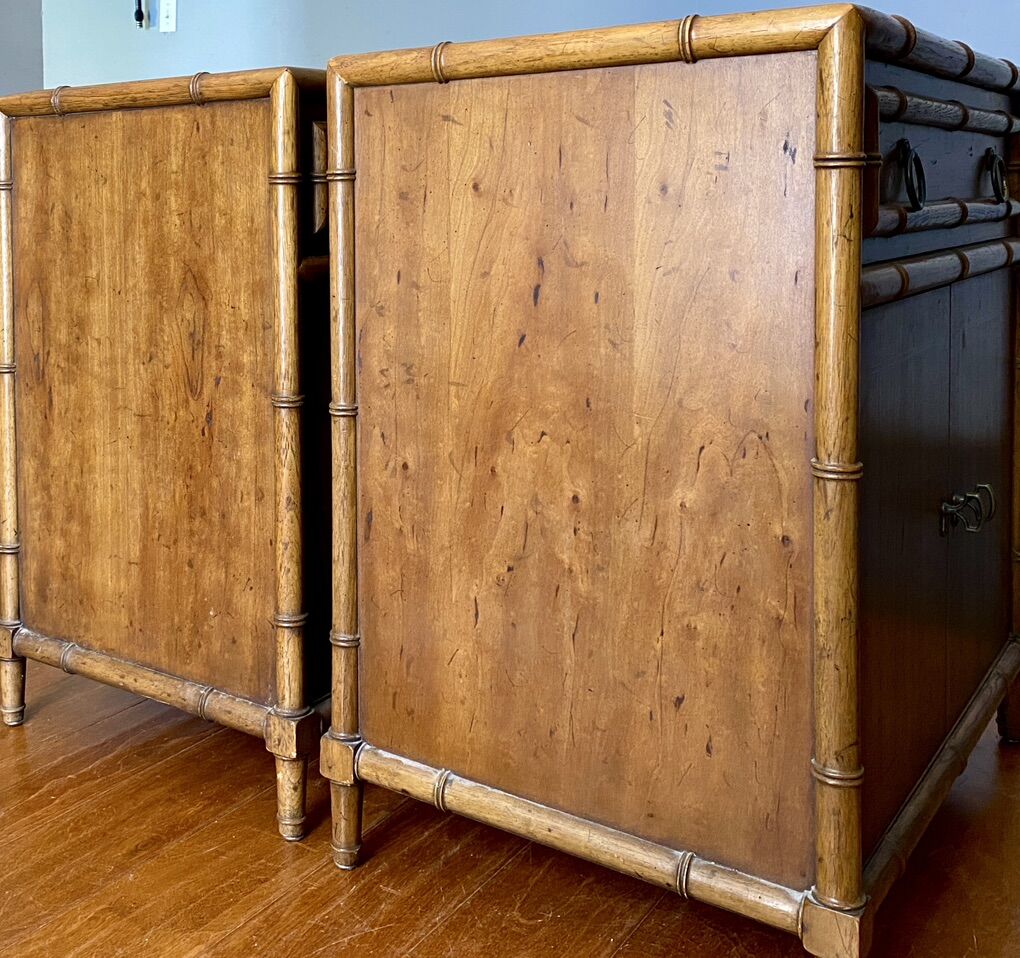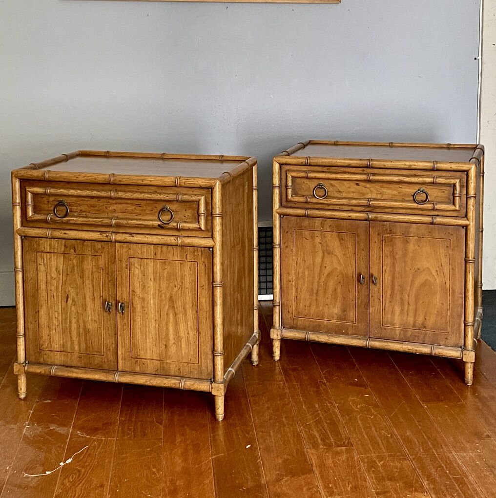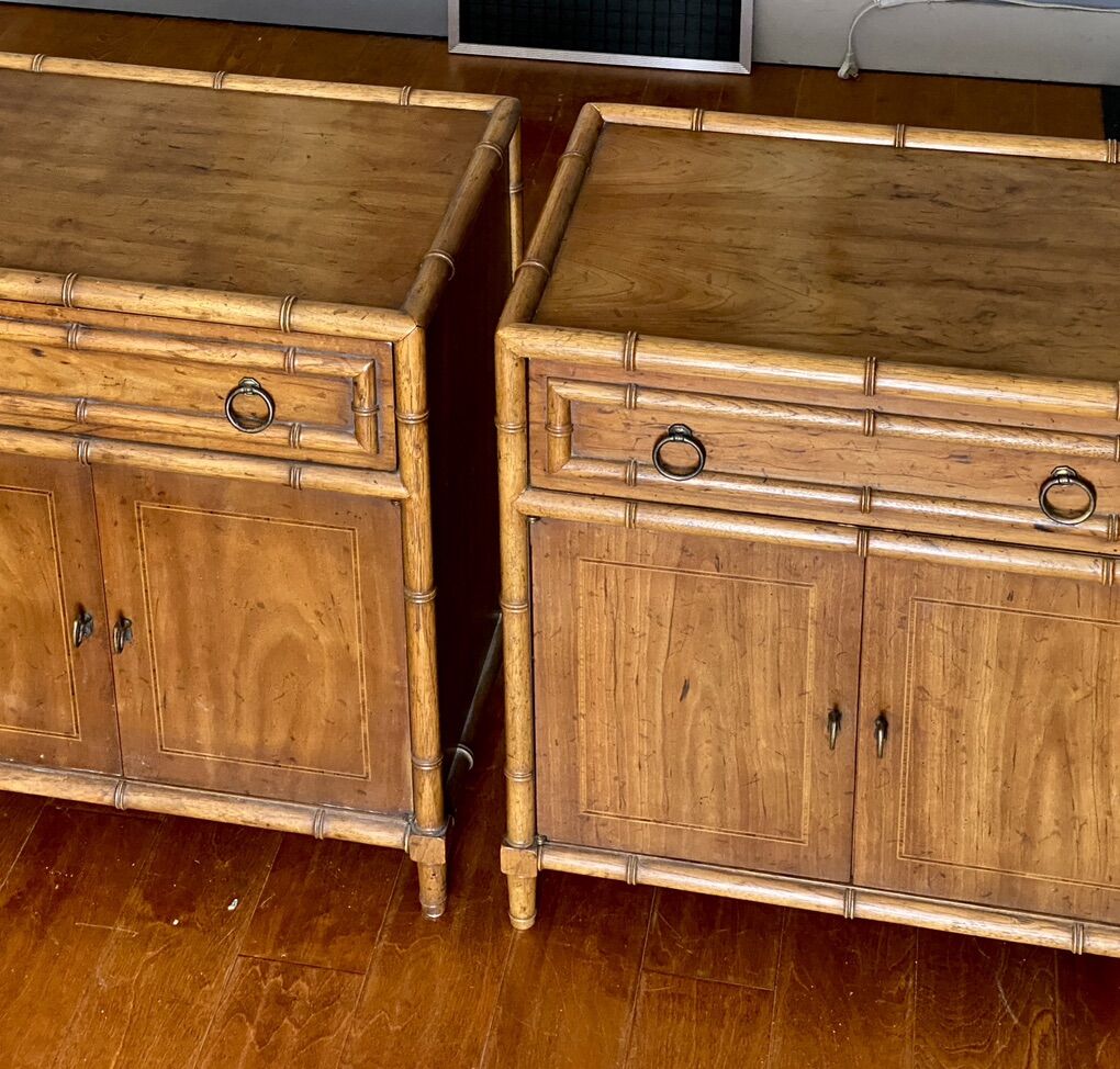 1966 Vintage Solid Walnut and Burl Wood Side Cabinets. Drexel Heritage Grand Tour, Mid-Century Side Cabinets. These have been treated with loving care and in absolutely fantastic condition. Beautifully crafted of Burl Wood, solid Walnut, with faux bamboo motif. No laminates on particle board to be found. These are the real deal.