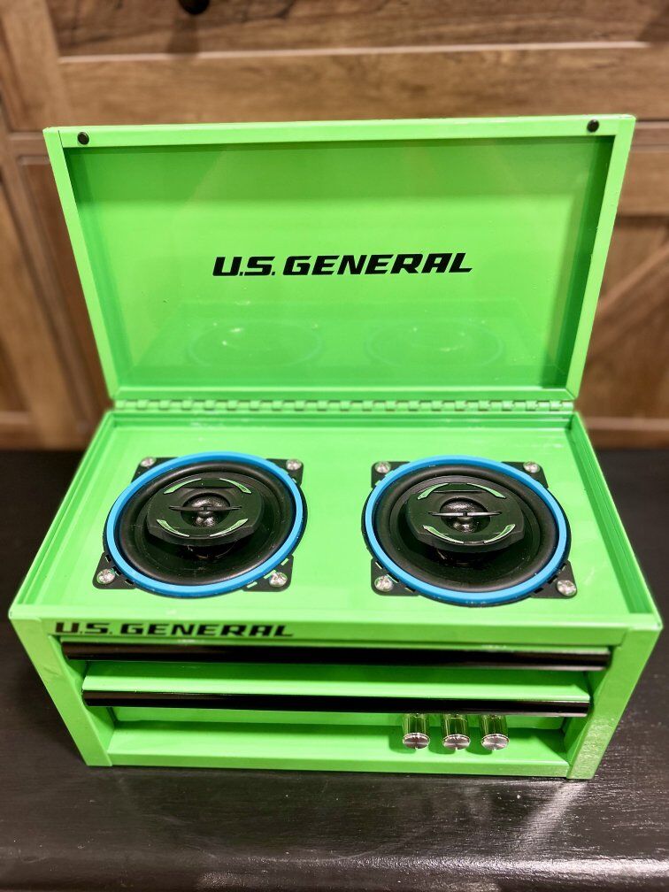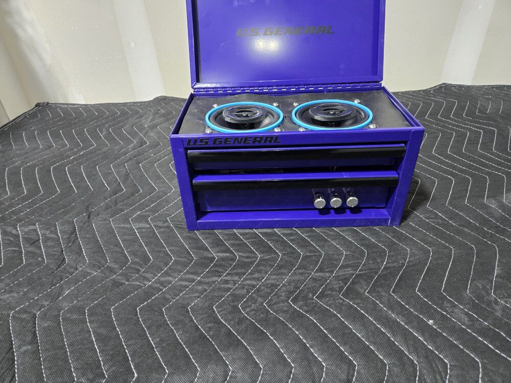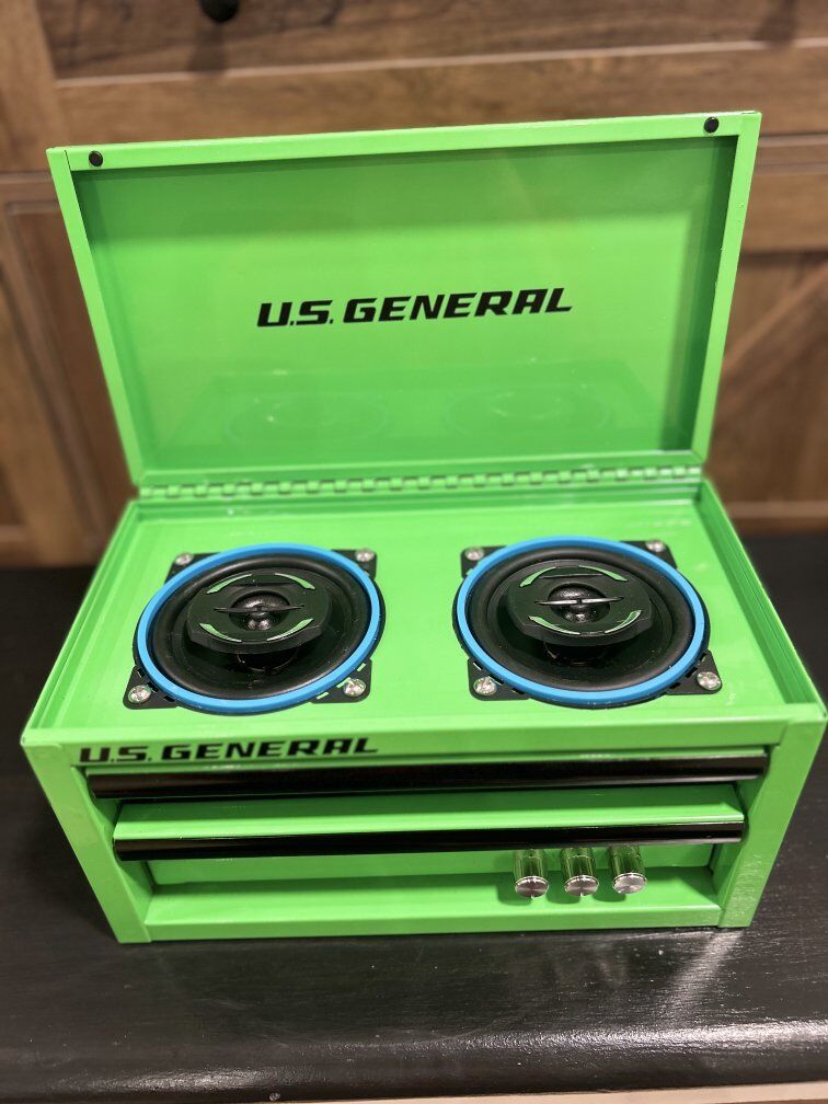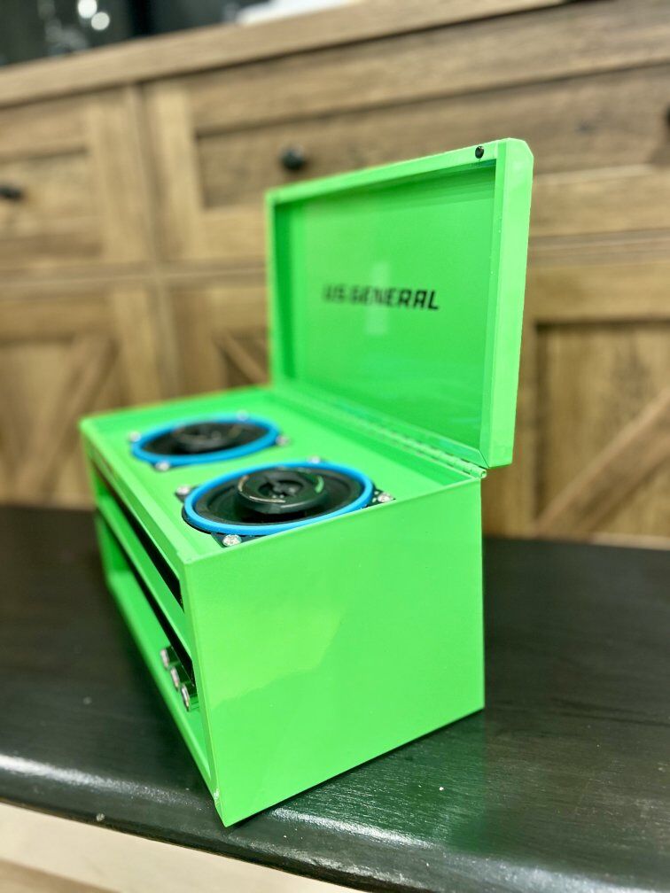 Mini Toolboxes converted to perfect accessories for you garage with an 50+50W amplifier with battery to run your new garage speaker system. Two 4" speakers with an Aux port to plug into amp if you want to plug in another device. Toolbox comes with charger to charge battery.