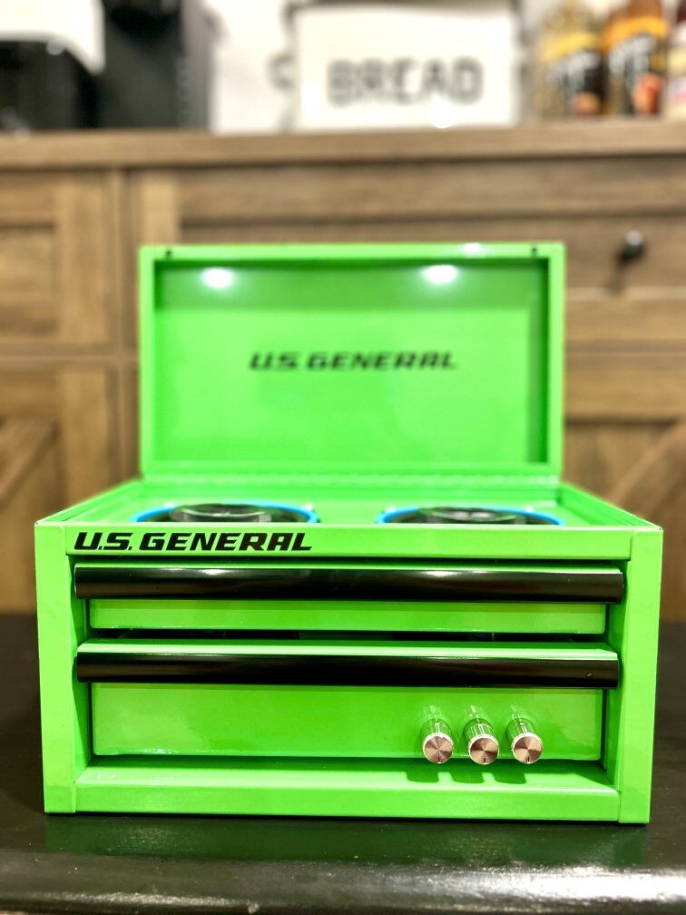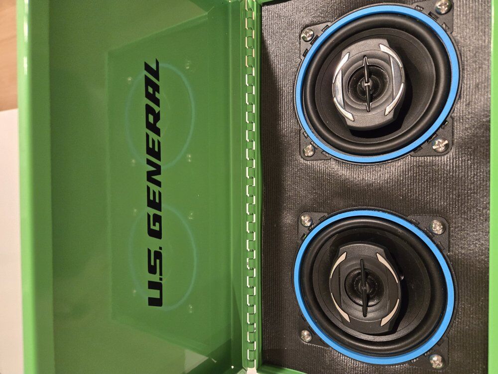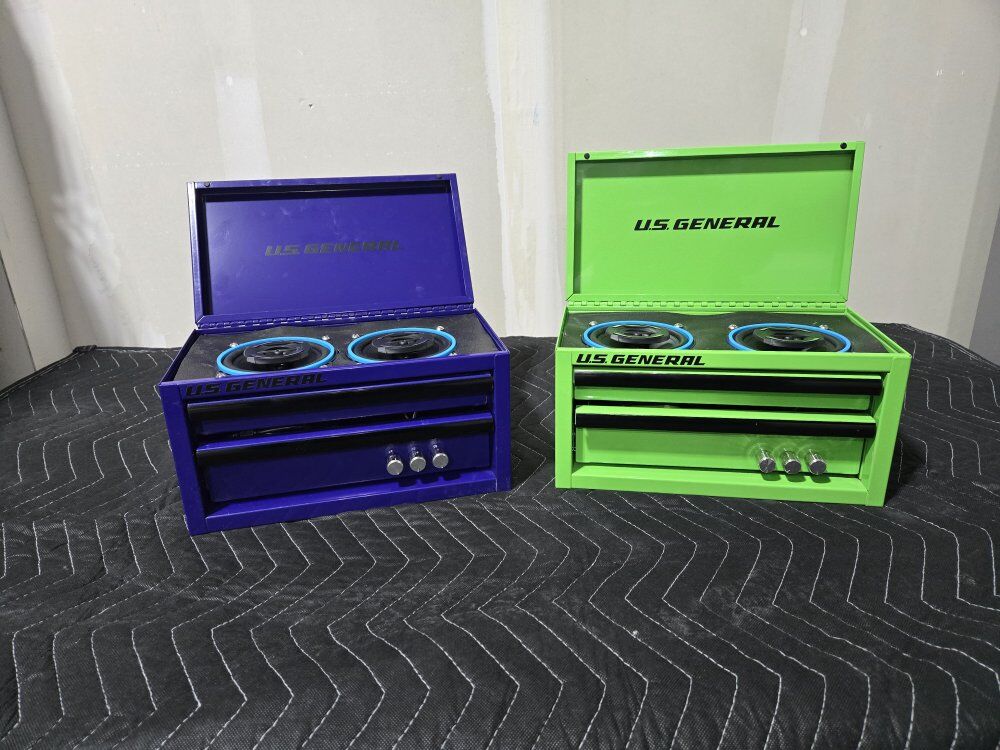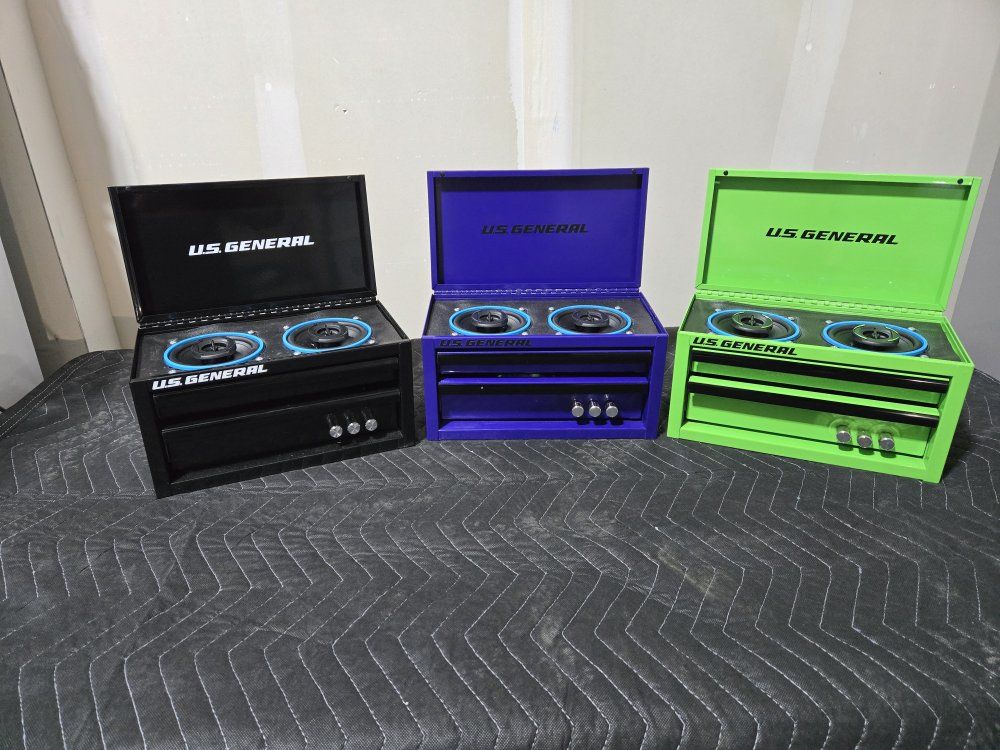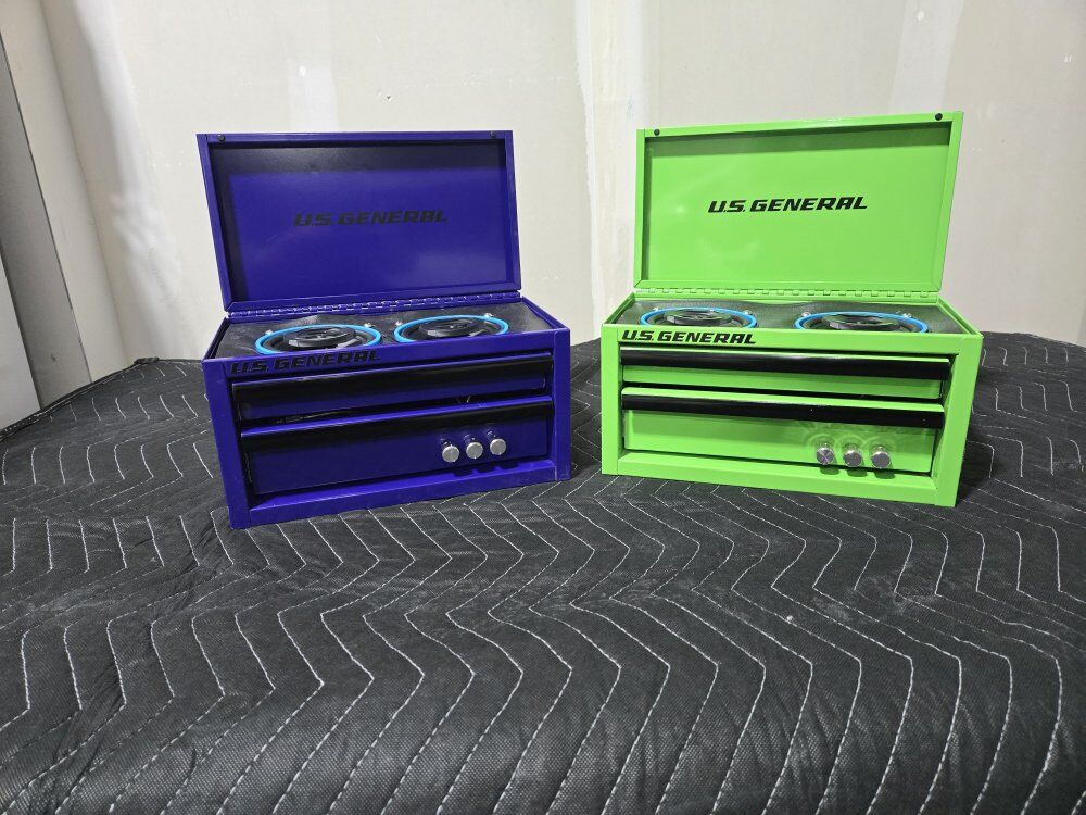 Mini Toolboxes converted to perfect accessories for you garage with an 50+50W amplifier with battery to run your new garage speaker system. Two 4" speakers with an Aux port to plug into amp if you want to plug in another device. Toolbox comes with charger to charge battery.